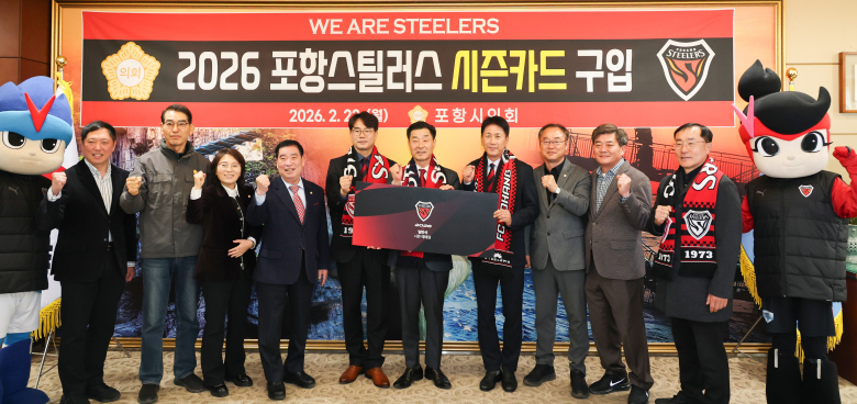 포항시의회가 ‘2026 포항스틸러스 시즌카드’를 구입하며 올 시즌 지역 연고 프로축구단의 선전을 기원했다.포항시의회는 23일 오전 의장실에서 시즌카드 구입 행사를 열고, 지역 스포츠 발전과 시민 화합을 위한 응원의 뜻을 모았다. 이날 행사에는 김일만 의장을 비롯해 이재진 부의장, 상임·특별위원장단과 포항스틸러스의 김상락 사장, 이종하 단장, 박태하 감독 등이 참석했다.김 의장은 “포항시민과 포항시의회는 언제나 스틸러스와 함께하고 있다”며 “시민들의 뜨거운 응원을 발판 삼아 올 한 해도 더욱 성장하고 도약하는 포항스틸러스가 되길 바란다”고 말했다.이에 김상락 포항스틸러스 사장은 “시즌카드 구매로 힘을 보태주신 포항시의회에 깊이 감사드린다”며 “지역사회의 기대와 응원에 부응할 수 있도록 철저히 준비해 좋은 경기력으로 보답하겠다”고 화답했다.포항시의회는 이번 시즌카드 구입을 계기로 지역 대표 구단과의 유대감을 강화하고, 스포츠를 통한 시민 결속과 지역 이미지 제고에도 힘을 보탤 계획이다.