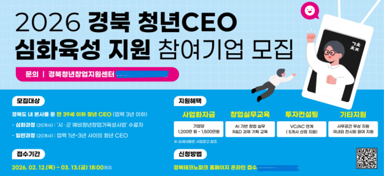경북도가 3월13일까지 창업 초기 청년기업의 안정적인 정착과 성장을 지원하고자 ‘2026 경북 청년CEO 심화육성 지원사업’ 참여 기업 40개사를 모집한다. 이는 경북청년창업지원센터(이하 ‘센터’)에서 수행하며, 신청 대상은 경북도 내 사업장(본사)을 둔 창업 1년 ~ 3년 이내 기업으로, 대표자가 39세 이하의 청년창업기업이다. 올해는 지역 청년창업 활성화를 위해 전년도보다 지원 대상을 10개사 확대해 총 40개사를 선정한다. 운영 과정은 공개모집을 하는 ‘일반과정(20개사)’과 시·군에서 예비청년창업가육성사업을 수료한 기업을 대상으로 하는‘심화과정(20개사)’으로 나뉘어 진행된다.모집 분야는 기술창업, 지식창업, 6차 산업, 일반창업 등 전 분야이며, 선정된 기업에는 기업당 최대 1500만원의 창업활동비가 지원된다. 참여를 희망하는 청년창업기업은 (재)경북테크노파크 홈페이지와 경북청년창업지원센터(053-819-3072) 누리집에서 공고문을 통해 자세한 내용을 확인할 수 있다.이상수 경북도 지방시대정책국장은 “청년 CEO 심화육성 사업을 통해 청년 창업기업의 역량 강화를 지원해 왔다”며 “앞으로도 청년기업이 변화하는 산업 환경에 대응하며 안정적으로 성장할 수 있도록 지원을 이어가겠다”고 말했다.