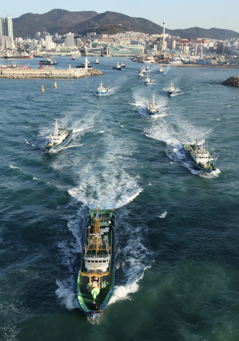 23일 대형선망 어선들이 부산 서구 공동어시장에서 출항해 먼바다로 나가고 있다. 연합