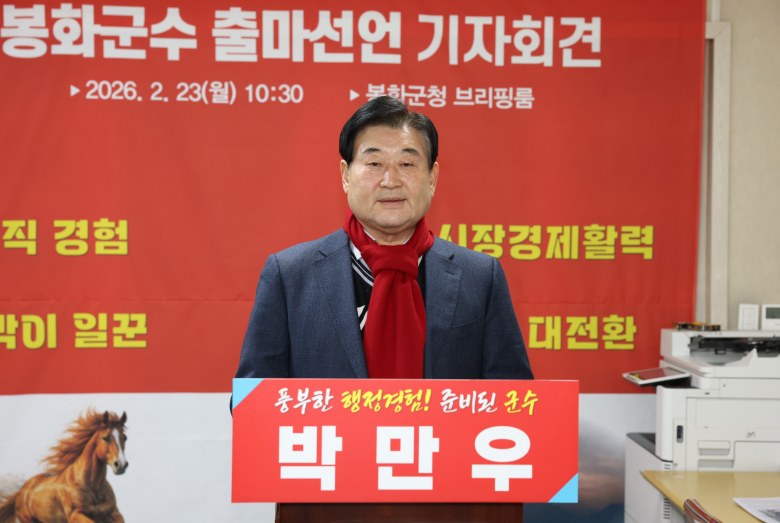 박만우 봉화농협 조합장이 ‘행정전문가, 농업대전환, 함께하는 군수’를 슬로건으로 내걸고 봉화군수 선거 출마를 공식 선언했다.박 조합장은 23일 봉화군청 브리핑룸에서 기자회견을 열고 “급격한 인구감소로 지역소멸 위기에 놓인 봉화의 시장경제와 농·상·공업에 새로운 활력을 불어넣어야 한다는 시대적 소명을 안고 출마를 결심했다”고 밝혔다.그는 봉화군의 최대 현안으로 인구감소, 지역경제 기반 위축, 농업소득 정체를 꼽았다. 박 조합장은 “지난 3년간 봉화 인구가 2000여 명이나 급감해 향후 3~4년 내 인구 2만5000명선 붕괴가 우려된다”며 “농업소득이 1000만 원대에 머무는 현실은 군민들이 행복한 미래를 향한 희망의 꿈을 꾸지 못하게 만들고 있다”고 진단했다.출마 배경에 대해 그는 “봉화를 지역소멸 위기에서 벗어나게 하고, 군민 모두가 꿈과 희망을 가지고 미래를 준비하며 행복한 삶을 누릴 수 있는 고장을 만들기 위함”이라며 이를 ‘새로운 가치 희망봉화’ 비전으로 제시했다. 자신을 ‘평생 봉화를 떠나지 않은 토박이 일꾼’이라 소개하며, 40년간 지방행정·농업정책 경험과 농림축산식품부 K농정위원, 봉화농협 재선 조합장 경력을 강점으로 내세웠다.군정 운영 방향으로는 “현장에서 해답을 찾고 군민들의 다양한 목소리를 정책결정의 나침반으로 삼을 것”이라며 산업 활동 대변화, 교통 인프라 확충, 생활인구 유입과 정주여건 개선을 핵심 과제로 제시했다. 특히 “전국 5위 재배면적인 사과산업의 경매를 포함한 유통 혁신 등 농업의 대전환, 시장 상권 활성화, 천혜의 생태환경과 연계한 체류형 관광벨트 조성을 추진하겠다”고 밝혔다.박 조합장은 “봉화토박이, 정통 행정가, 농협경영의 축적된 경험을 토대로 오늘의 위기를 극복 하겠다”며 “행정경륜이 있는 군수, 농업 대전환 군수, 군민과 함께하는 군수가 돼 ‘희망봉화’를 만들어 가도록 저의 모든 것을 바치겠다”고 말했다.