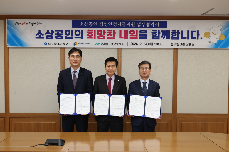 대구 중구가 지난 24일 구청 상황실에서 대구신용보증재단, iM뱅크 중구청지점과 업무협약을 체결하고 총 30억 원 규모의 ‘2026년 소상공인 경영안정자금’을 지원한다고 밝혔다.이번 사업은 고금리 장기화와 내수 회복 지연으로 어려움을 겪는 지역 소상공인의 자금난 해소와 이자 부담 완화를 위해 마련됐다.