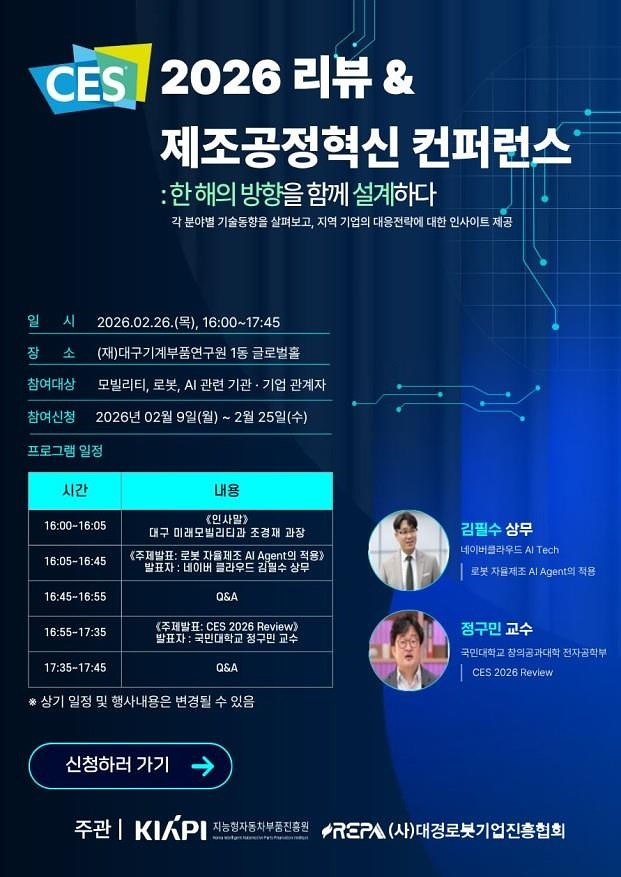 대구시는 오는 26일 오후 4시 대구기계부품연구원 글로벌홀에서 제조혁신 미래차 전환의 해법을 찾기 위한 ‘CES 2026 리뷰&제조공정혁신 컨퍼런스’를 개최한다고 24일 밝혔다.이번 행사는 지난 1월 미국 라스베이거스에서 열린 세계 최대 IT 전시회 ‘CES 2026’의 핵심 기술 동향을 지역 산업계에 공유하고, 인공지능(AI)을 활용한 제조공정 혁신 방안을 모색하기 위해 마련됐다.이번 컴퍼런스에는 지역 모빌리티·로봇·AI 관련 기업 종사자 및 관계자 60여 명이 참석해 미래 신산업 연착륙을 위한 실질적인 가이드라인을 논의할 예정이다.컨퍼런스의 첫 번째 세션에는 네이버클라우드 김필수 상무가 ‘로봇 자율제조 AI 에이전트의 적용’을 주제로 강연에 나선다. 생성형 AI가 제조 현장의 로봇과 결합해 스스로 공정을 최적화하는 최첨단 솔루션을 소개하며, 지역 기업들이 당면한 생산성 향상을 위한 해법을 제시한다.두 번째 세션은 정구민 국민대 교수가 ‘CES 2026 리뷰’를 통해 올해 전시회를 관통한 글로벌 기술 트렌드와 미래차 시장의 변화를 심도 있게 분석하고, 지역 기업의 대응 전략에 대한 인사이트를 제공한다.정의관 대구시 미래혁신성장실장은 “글로벌 공급망 재편과 미국 관세정책 등 대외 불확실성이 가중되는 상황에서, 글로벌 혁신 기술의 정점인 CES에서 확인된 혁신 기술과 산업 흐름을 공유하는 것은 의미가 크다”며 “지역 기업들이 급변하는 산업 환경에 선제적으로 대응하고 경쟁력을 확보할 수 있도록 지원을 아끼지 않겠다”고 말했다.한편, 대구시는 지역 자동차 부품기업의 미래차 산업 전환을 위한 2개 분야의 지원사업 참여 기업을 모집 중이며 ‘미래차 전환 컨설팅’은 산업통상부 사업재편 승인을 준비하는 중소기업 3개사를 선정해 지원하고 ‘미래차 부품 시제품 제작 지원’은 전기차·자율주행차 관련 부품 개발 기업 8개사를 선정한다.신청은 오는 3월 3일까지 대구 미래차전환 종합지원센터 홈페이지(www.d-fmts.or.kr)에서 가능하다.