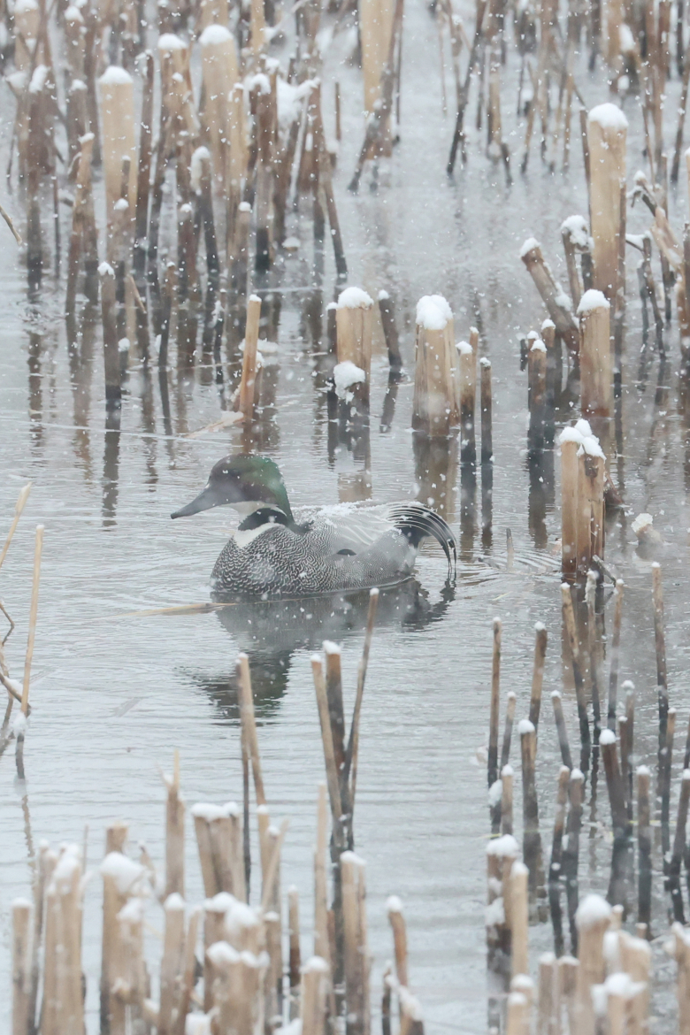 24일 세종시 세종호수공원에서 청둥오리 한 마리가 눈을 맞으며 먹이활동을 하고 있다. 연합