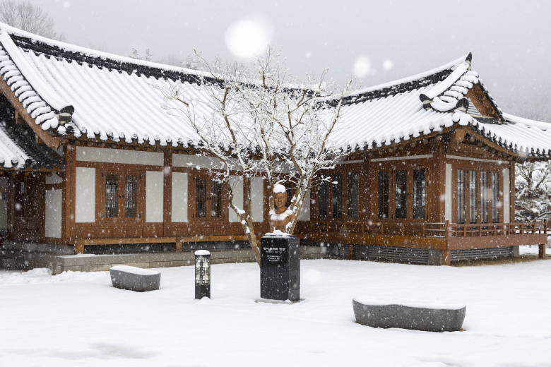 지난 24일 칠곡군에 눈이 내리면서 향사아트센터 일대가 저녁까지 하얗게 덮였다. 전통 한옥 양식의 기와지붕과 마당, 주변 수목 위로 눈이 쌓이며 평소와 다른 모습이 연출돼 이례적인 봄 설경을 남겼다.