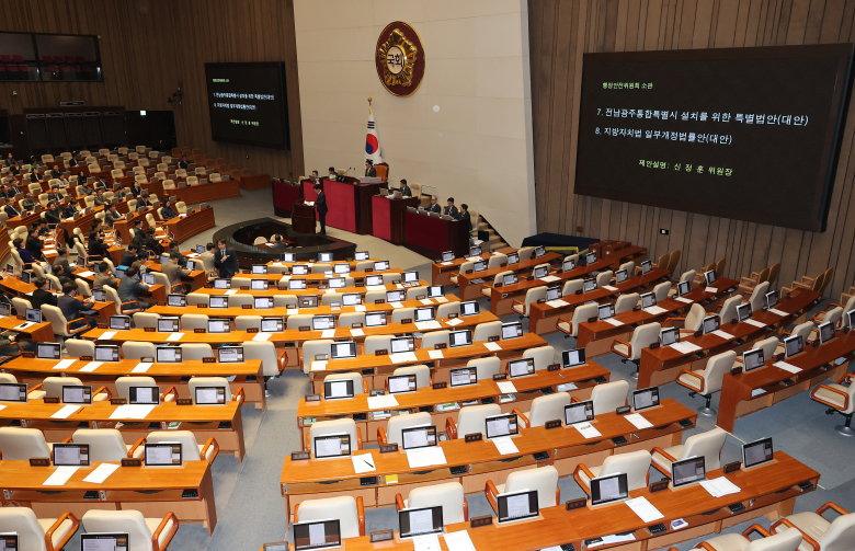 국민의힘은 2일 더불어민주당을 향해 대구·경북 행정통합법 처리 필요성을 강조하면서 국회 법제사법위원회 전체회의 개최를 촉구했다.국민의힘 송언석 원내대표는 2일 더불어민주당을 향해 "오늘이라도 국회 법제사법위원회와 원포인트 본회의를 열어 대구·경북(TK) 행정통합법안을 처리할 것을 촉구한다"고 밝혔다.최수진 원내수석대변인도 이날 논평을 내고 "500만 시·도민의 염원이 거대 여당의 치졸한 '침대 축구'에 짓밟히고 있다"고 밝혔다.송 원내대표는 이날 국회에서 열린 최고위원회의에서 "민주당이 어제 결국은 TK 통합법 처리를 위한 법사위 개최를 거부하고 본회의에서 전남·광주 통합법만 일방 처리했다"고 강조했다.또 "아직 2월 임시국회가 하루 남았다. 핑계 찾아 삼만리 그만하라"면서 "광주·전남, 대구·경북, 대전·충남 모두 대한민국이기에 대한민국의 대통령과 집권여당은 더 이상 지역을 이간질하며 국민을 분열시키는 정치는 중단하라"고 촉구했다.최 원내대변인은 "민주당 소속인 추미애 법사위원장은 '대구시의회의 반대'를 핑계 삼아 대구·경북 행정통합법 처리를 일방적으로 보류했다"며 "하지만 대구시의회가 전폭적인 찬성 성명을 내면서 그 알량한 명분은 단숨에 산산조각 났다"고 언급했다.이어 "방패막이가 사라지자, 민주당은 이번에는 도리어 '야당이 미온적'이라는 황당한 억지를 부린다"면서 "이미 국민의힘은 대구·경북 의원들의 총의를 모아 당론으로 못 박고, 원내대표가 직접 신속 처리를 강력히 압박한 상태"라고 지적했다.특히 "급기야 민주당은 '필리버스터 때문에 법사위를 못 연다'는 해괴한 변명까지 꺼내 들었고 국민의힘은 대승적 결단으로 야당의 합법적 저항 수단인 필리버스터마저 과감히 전면 중단했다"고 설명했다.최 원내대변인은 "한병도 민주당 원내대표는 권한없는 기초의회까지 끌어들이며 '단일안을 진정성있게 넣어라' 하며 치졸한 핑계를 대고 있다"며 "전형적인 내로남불의 행태이며, '내 텃밭만 챙기고 보수 영남권은 짓밟겠다'는 악의적인 핑계"라고 했다.송언석 원내대표는 "민주당이 어제 법사위 개최를 거부한 이유는 전남·광주, 대구·경북, 충남·대전 통합 모두 쌍둥이 법이기 때문에 대구·경북과 충남·대전을 같이 처리해야 한다는 주장이었다"며 "그런 논리라면 왜 유독 전남·광주만 처리한 것은 애초부터 특정 지역을 몰아주기 위한 의도였다고 해석할 수밖에 없다"고 말했다.한편, 김민석 국무총리는 지난달 28일 대구 엑스포에서 열린 제66주년 2·28 민주운동 기념식에 참석해 "대구·경북 행정통합 차질없이 추진하겠다"고 밝힌바 있다.