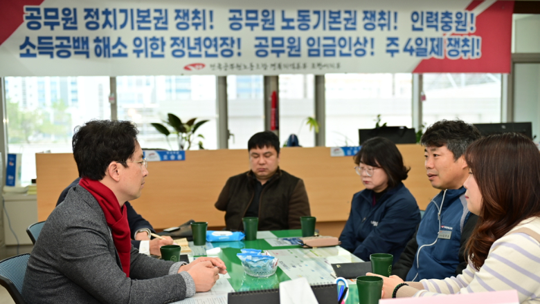 김병욱 포항시장 예비후보가 “포항시민의 노조위원장이 되겠다”며 공직사회 혁신을 전면에 내세웠다.김 예비후보는 3일 오전 포항시청 5층 공무원 노동조합 사무실을 방문해 전국공무원노동조합 포항시지부 관계자들과 면담을 갖고, ‘신명 나게 일하는 포항시청’을 목표로 한 5대 조직 혁신 공약을 발표했다.김 예비후보는 현재 전국퇴직공무원노동조합 입법위원장을 맡고 있다는 점을 알리며 “공직의 애환과 행정 시스템의 고충을 누구보다 잘 아는 공직 선후배이자 동료”라고 자신을 소개했다. 그는 “밀실 인사와 줄 세우기 관행을 끝내고, 일하는 공무원은 확실히 보호하겠다”고 밝혔다.이날 면담에서 노조 측은 ▲열악한 청사 내 복지시설 확충 ▲재난·행사 시 과도한 비상근무 체계 개선 ▲휴직 등으로 인한 상시결원 문제에 대한 근본적인 인력 충원 대책 마련 등을 요구했다.이에 김 예비후보는 인사·조직 혁신을 핵심으로 한 공약을 제시했다. 그는 “깜깜이 승진과 정실 인사를 완전히 없애겠다”며 직렬·성별·성과를 반영한 예측 가능한 승진 시스템과 실·국장 책임경영제 도입을 약속했다.또 악성 민원 대응을 위해 전담 태스크포스(TF) 운영, 공무원 법률보험 및 심리상담 지원 확대 등 보호 장치 강화 방안을 제시했다. 비상근무와 결원 문제에 대해서는 비상근무 수당과 휴식권 현실화, 육아휴직 등으로 인한 결원 발생 시 즉각적인 대체 인력 확충과 대체근무자 수당 도입을 공언했다. 이와 함께 전문직위 지정 확대, 적극행정 면책 강화, 불필요한 의전과 보고서류 감축, 직원 전용 휴게공간 및 부서별 소통 공간 확충 등 조직문화 개선 방안도 내놓았다.김 예비후보는 “공무원이 행복해야 시민에게 돌아가는 행정 서비스의 질도 높아진다”며 “포항시 공무원 2300여 명을 행정 인력이 아닌 포항 재건의 혁신 파트너로 대우하겠다”고 말했다.김무윤 지부장은 “현장의 고민을 구체적으로 담아낸 공약”이라며 “노동조합과 지속적으로 소통하며 건강한 공직문화를 만들어 가길 기대한다”고 말했다.