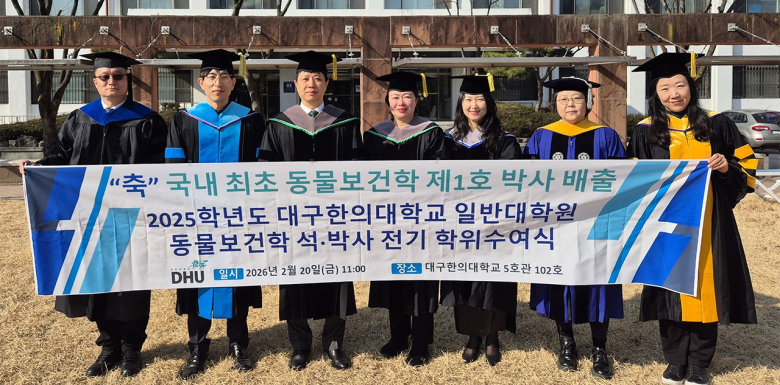 글로컬대학 대구한의대학교가 대한민국 동물보건학 분야에서 새로운 전기를 마련했다. 일반대학원 동물보건학과에서 국내 최초 ‘동물보건학 박사 1호’를 배출하며 해당 분야의 학문적 독립성과 연구 전문성을 대외적으로 입증했다.이번 박사학위의 주인공은 반려동물 재활·한방통합치료 전문가인 신사경 원장(VIP 동물한방재활의학센터)과 유기동물 복지 연구를 수행한 조경 박사다. 두 연구자는 각각 재생의학 기반 임상 연구와 전주기적 동물복지 체계 연구를 통해 동물보건학의 외연을 치료 중심에서 복지·정책 영역까지 확장했다는 평가를 받고 있다.신사경 박사는 반려동물 관절염 치료를 위한 줄기세포 기반 재생치료제 개발 연구로 박사학위를 받았다. 연구는 퇴행성 관절질환(Osteoarthritis, OA)을 겪는 반려동물을 대상으로, 탈세포화 세포외기질(dECM) 하이드로겔과 줄기세포를 결합한 재생치료 전략의 효과를 과학적으로 규명하는 데 초점을 맞췄다. 연구 결과는 국제 학술지 In Vivo에 게재되며 학술적 검증을 마쳤다.동물모델과 세포실험을 병행한 결과 염증성 사이토카인(IL-1β, IL-6, TNF-α)이 유의하게 감소하고 연골 구조가 보존되는 것으로 나타났다. 이는 기존의 진통·소염 위주 치료에서 나아가 질병 진행 억제와 조직 재생 가능성을 동시에 제시한 연구로 주목받는다.