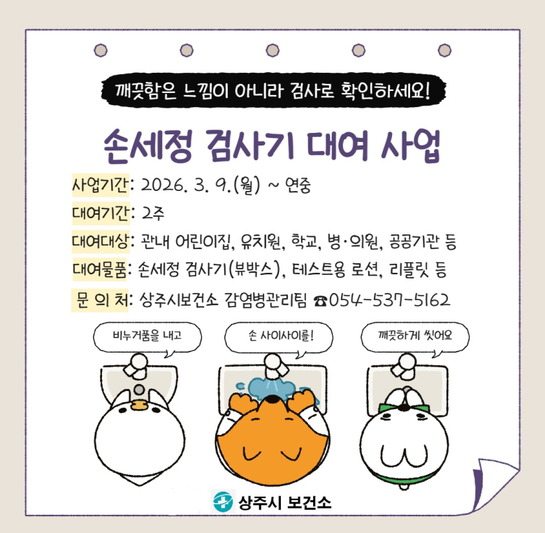 상주시보건소는 지역 어린이집, 유치원, 학교, 공공기관 등을 대상으로 올바른 손씻기 습관 형성과 감염병 예방을 위한 ‘손세정 검사기 대여 서비스’를 이달부터 연중 운영한다고 밝혔다. 이번 사업은 손씻기 교육의 효과를 높이기 위해 손세정 검사기를 활용, 손씻기 전ㆍ후 상태를 시각적으로 확인할 수 있도록 지원하는 프로그램이다. 형광물질이 포함된 UV로션을 바른 뒤 손을 씻고, 전용 검사기를 통해 세정 상태를 확인함으로써 손씻기의 중요성과 올바른 방법을 자연스럽게 익힐 수 있도록 돕는다. 보건소는 신청 기관을 대상으로 관련 물품을 최대 2주 이내로 대여하며, 연령별 눈높이에 맞춘 손씻기 교육자료와 안내문도 함께 제공한다. 이를 통해 각 기관에서는 자체 교육 프로그램과 연계해 체험 중심의 위생 교육을 실시할 수 있다.