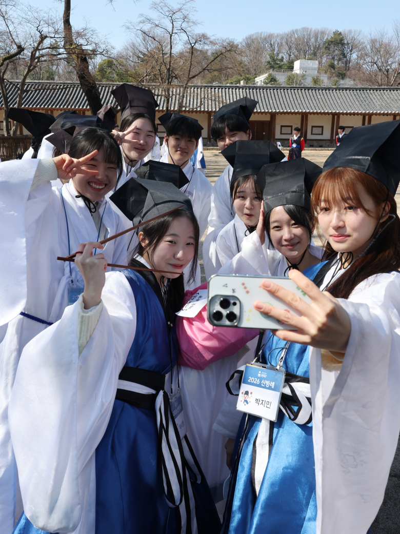 8일 서울 종로구 성균관대학교 명륜당에서 열린 신입생 환영회 신방례에서 신입생과 재학생들이 함께 기념촬영을 하고 있다. 연합