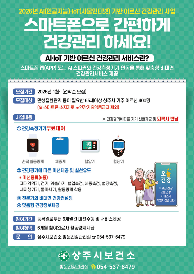 상주시보건소는 지역 어르신의 만성질환 예방과 건강생활 실천을 돕기 위해 ‘2026년 AI·IoT 기반 어르신 건강관리사업’ 참여자를 3월 말까지 선착순으로 모집한다. 이번 사업은 허약관리 및 건강습관 개선이 필요한 65세 이상 어르신 400명을 대상으로 하며 불필요한 방문 횟수를 줄이고 건강측정기기 및 스마트폰을 통해 보건소의 건강관리 상담을 받을 수 있는 비대면 건강관리 프로그램으로 구성돼 있다. 참여자에게는 손목 활동량계, 체중계, 혈압계, 혈당계 등 개인별 건강측정기기를 무료로 대여하며 6개월간 ▲ 맞춤형 건강미션(고혈압, 당뇨 관리, 신체활동 등)▲ 간호사 등 전문인력의 비대면 건강상담 및 건강컨설팅 ▲ 개인 건강상태에 맞는 건강정보 제공 등의 서비스를 지원한다. 박영순 질병관리과장 “스마트폰을 활용한 새로운 건강관리 서비스로 만성질환을 예방하여 어르신들이 건강한 삶을 지속할 수 있도록 노력하겠다”고 했다. 모집은 선착순으로 진행되며 참여 신청 및 문의는 상주시보건소 방문건강관리실(054-537-6479)로 하면 된다.