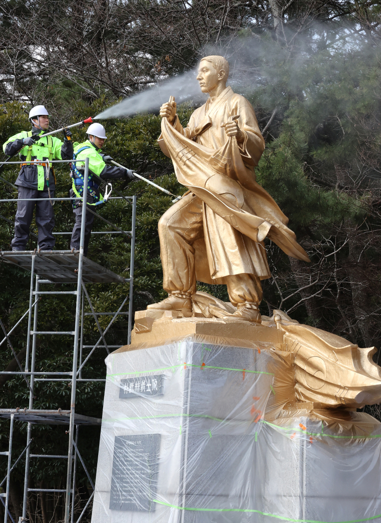 12일 부산 부산진구 어린이대공원 수변공원에서 부산시설공단 관계자들이 봄맞이 환경정비 일환으로 박재혁 의사 동상을 청소하고 있다.