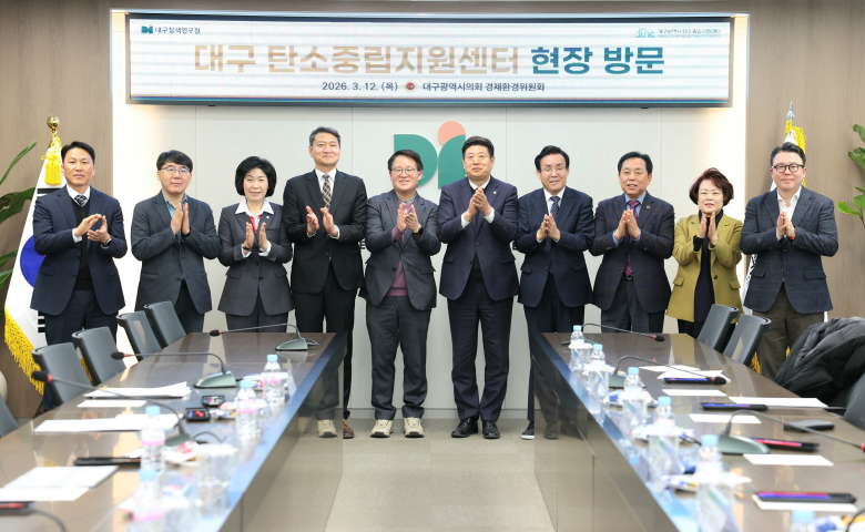 대구시의회 경제환경위원회(위원장 김재용)는 12일 대구정책연구원 내 있는 ‘대구탄소중립지원센터’를 방문해 지역 기후 위기 대응 및 탄소중립 이행 상황을 점검하고 2050 탄소중립의 차질 없는 실현을 위한 체계적인 업무 추진을 주문했다.이날 센터를 방문한 위원들은 남광현 센터장으로부터 센터 추진 사업 실적 및 향후 운영 계획에 대한 브리핑을 듣고, 대구시 및 센터 관계자들과 함께 실효성 있는 탄소중립 정책 추진 방안을 논의하는 시간을 가졌다.특히 올해부터 오는 2028년말까지 재수탁 기간의 센터 운영 로드맵과 국·시비 예산(연간 4억원)의 집행 효율성 등에 대해서도 면밀히 살폈다.경환위 위원들은 이날 현장에서 제안된 의견들이 대구시 기후·환경 정책 전반에 반영되고 관련 정책들이 시민들의 삶에 실질적인 도움이 될 수 있도록 지속적으로 점검하기로 했다.김재용 위원장은 “전 세계적으로 탄소중립은 선택이 아닌 필수 생존 전략이 된 상황에서, 탄소중립지원센터가 대구시의 지역 특화형 탄소중립 이행모델을 발굴하고 기후 위기 적응을 위한 명확한 방향을 제시하는 싱크탱크로서 제 역할을 다해 달라”고 말했다.한편, ‘대구탄소중립지원센터’는 대구시의 탄소중립·녹색성장 기본계획 수립 지원, 온실가스 통계 분석, 기후 위기 적응 대책 이행 지원 등을 수행하기 위해 ‘탄소중립기본법’에 근거해 2022년 7월에 설립된 기후·환경 부문 전문 연구기관으로, (재)대구정책연구원이 그 운영 업무를 수탁해 각종 사업을 추진 해오고 있다.