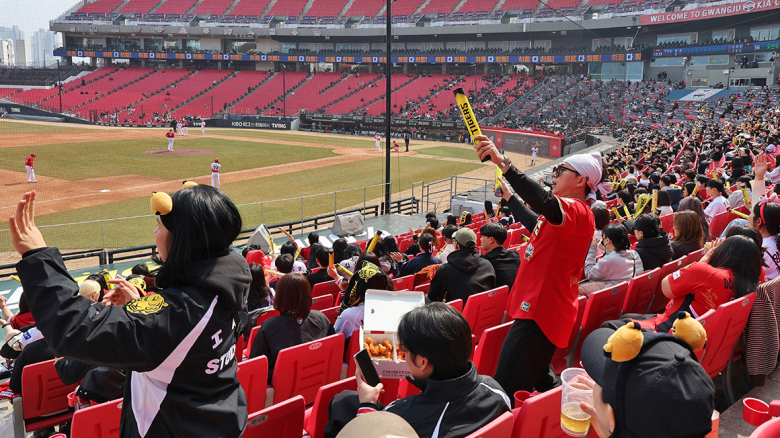 12일 광주기아챔피언스필드에서 열린 프로야구 SSG 랜더스와 KIA 타이거즈의 시범경기. 야구팬들이 응원전을 펼치고 있다.
