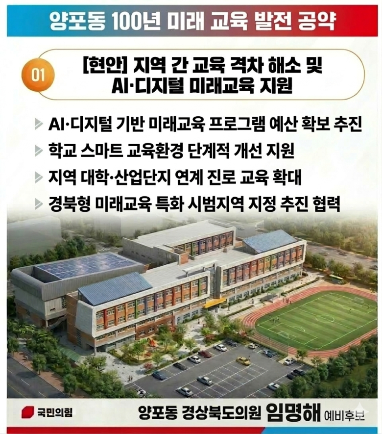 구미시 제8선거구(양포동) 경상북도의원 선거에 출사표를 던진 임명해 예비후보가 지역의 최대 현안인 교육 격차 해소와 미래 교육 기반 구축을 위한 청사진을 공개했다.25년 넘게 교육 현장을 지켜온 전문가답게 단순한 시설 확충을 넘어선 소프트웨어 중심의 양포동형 미래 교육 모델을 제시해 주목받고 있다.임명해 예비후보는 "양포동은 구미에서 가장 젊고 역동적인 동네이지만 교육 인프라는 그 성장 속도를 따라가지 못하고 있다"며 "아이들이 거주 지역에 상관없이 공정한 교육 기회를 보장받는 교육 평등권을 반드시 실현하겠다"고 강조했다.임 후보는 빠르게 변화하는 교육 환경에 발맞춰 양포동의 교육 경쟁력을 높일 5가지 실천 과제로 ▲AI·디지털 기반 미래 교육 프로그램 예산 확보 총력 ▲노후화된 학교 시설의 단계적 스마트 교실 전환 개선 ▲지역 대학과 국가산업단지와 연계한 체험형 진로 프로그램 확대 ▲경북형 미래 교육 특화 시범지역 지정을 위한 도의회 차원의 협력 ▲아동·청소년의 정서적 안정과 심리 치료 지원 시스템 구축 등을 제시했다.임 예비후보는 양포동이 경북교육청의 미래 교육 정책을 실현할 최고의 거점임을 강조했다. 그는 "젊은 학부모들의 교육 열기가 뜨겁고 학생 수가 급격히 늘어나는 양포동은 디지털 교육 정책을 제도화하고 성공시키는 최적의 모델 지역"이라며 경북교육청과 협력을 약속했다.임 예비후보는 "도의원의 핵심 역량은 지역의 목소리를 정책에 반영하고 실질적인 예산을 끌어오는 것"이라며 "현장을 아는 교육 전문가로서 양포동의 아이들이 더 넓은 세상을 꿈꿀 수 있도록 교육의 토양을 비옥하게 다지겠다"고 밝혔다.