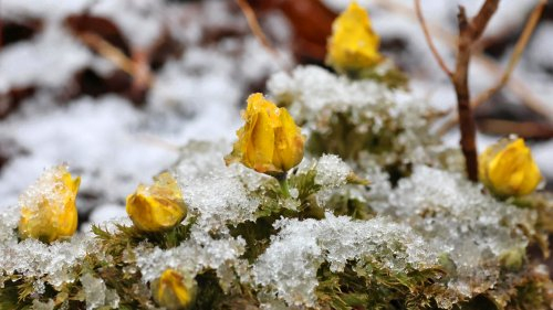강원 산간에 폭설이 쏟아진 13일 대관령 기슭인 강릉시 구정면의 한 계곡에서 노란 꽃을 피운 복수초가 흰 눈에 덮여 있다. 연합