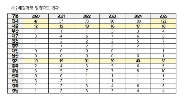 이주배경학생 밀집학교가 최근 5년간 2.6배나 증가한 것으로 나타났다.학령인구 감소에도 이주배경학생 수는 지난해 20만명을 돌파하며 급증하는 가운데 이들의 교육 여건 개선은 좀처럼 속도가 붙지 않는 모양새다. 작년 기준 이들은 전체 학령인구의 4%를 차지한다.15일 국회 교육위원회 소속 더불어민주당 진선미 의원이 교육부로부터 제출받은 자료에 따르면 전국 이주배경학생 밀집학교는 2020년 47곳에서 2025년 123곳으로, 5년새 2.6배 늘었다. 이주배경학생 밀집학교란 재학생 100명 이상인 학교 가운데 이주배경학생 비율이 30% 이상인 학교를 뜻한다.밀집학교 소재지를 시도별로 보면 경기가 52곳으로 압도적으로 많았다. 이어 서울 18곳, 충남 10곳, 대구 8곳, 인천 7곳 순이었다. 밀집학교가 가장 적은 지역은 대전·울산·전북으로 각각 1곳이었다.아울러 한국어학급 과밀 현상마저 심화하는 것으로 나타났다. 자료에 따르면 전국 한국어학급의 평균 학생 수는 2020년 13.8명에서 2024년 21.5명으로 급증했다. 한국어학급은 이주배경학생을 대상으로 운영되는데, 초기 적응을 돕고 집중적 교육을 통해 일반학급으로 완전히 전환하는 것을 목표로 한다. 교육부 가이드라인에서 제시한 한국어학급 적정 학생 수는 10명 내외다.2024년 기준 시도별 한국어학급 평균 학생 수를 보면 역시 경기가 28.9명으로 가장 많았다. 이어 경북(24.9명), 광주·충남(23.6명), 경남(22.7명) 순이었다. 제주(6명)와 대전(11.3명), 전남(12.5명), 전북(12.6명)을 제외한 대부분 지역이 교육부 가이드라인을 크게 상회했다.진선미 의원은 "이주배경학생이 어느 지역에 거주하든 필요한 교육을 충분히 받을 수 있도록 교육 여건을 보장하는 일이 시급하다"며 "교육 당국은 밀집·과밀 문제를 완화하고 교원과 지원 인력을 확충하는 등 실질적인 대책을 마련해야 한다"고 강조했다.