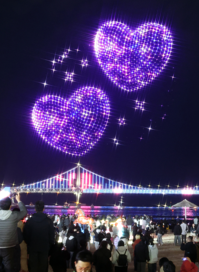 14일 부산 수영구 광안리해수욕장에서 화이트데이를 맞아 사랑과 로맨스를 테마로 한 드론 라이트 쇼가 펼쳐지고 있다. 연합