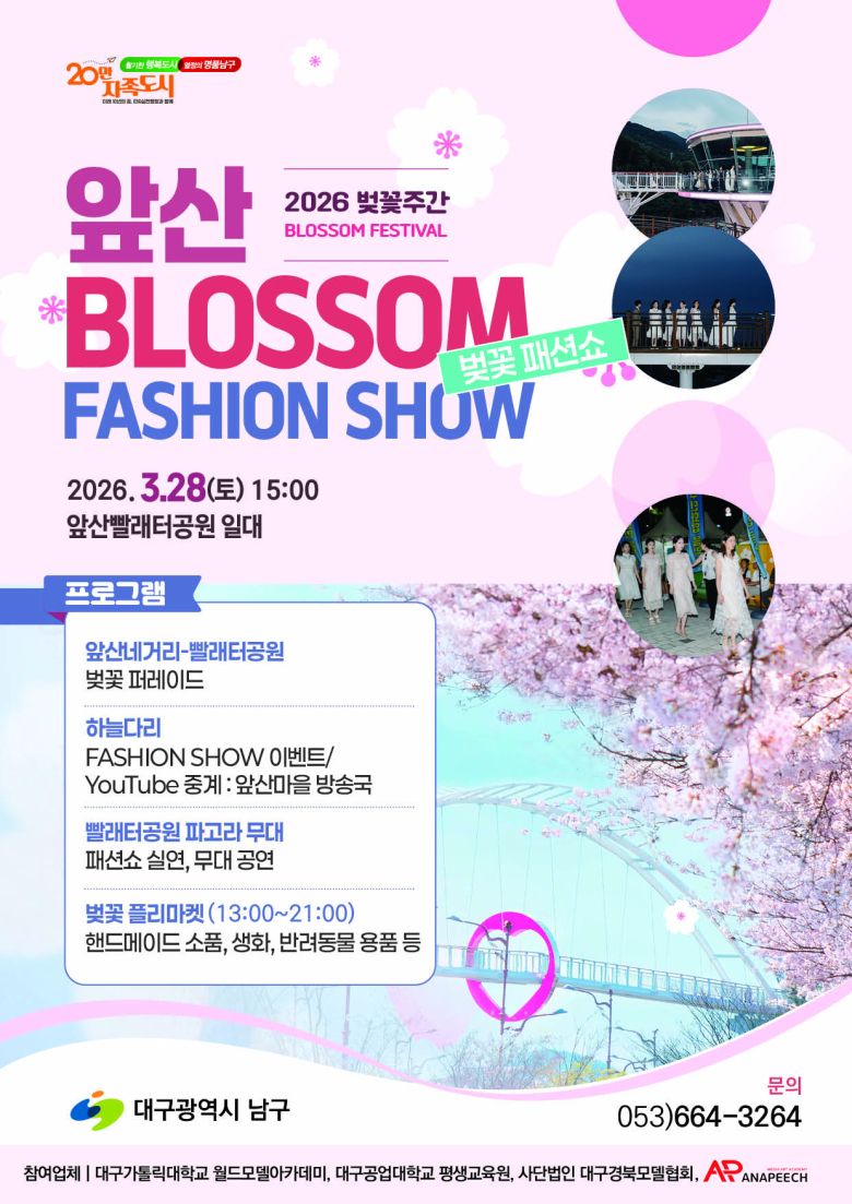 대구 남구가 벚꽃 개화 시기에 맞춰 앞산빨래터공원에서 벚꽃 패션쇼를 개최한다.남구는 오는 28일 앞산빨래터공원 특설무대와 앞산해넘이전망대, 하늘다리 일대에서 시민과 전문 모델이 함께하는 벚꽃 패션쇼 이벤트를 연다고 밝혔다.이번 행사는 지역 관광명소인 앞산빨래터공원을 알리고 침체된 지역 상권 활성화를 위해 마련됐다. 평소 접하기 어려운 패션쇼를 야외 관광지에서 개최해 봄철 앞산을 찾는 시민들에게 새로운 볼거리를 제공할 예정이다.패션쇼에는 대구가톨릭대와 대구공업대학교, 아나피치 학원 시니어 모델 과정, 대구경북모델협회 등 4개 단체에서 약 100명이 참여한다. 참가자들은 전통 한복과 하이패션 의상을 선보이며 다양한 무대를 펼칠 계획이다.행사와 함께 지역 소상공인들이 참여하는 플리마켓도 운영된다. 양말과 잠옷, 헤어 액세서리, 수제 캔들, 디퓨저, 가죽 소품, 여성복, 반려견 의류와 장난감 등 24개 업체가 참여해 다양한 상품을 선보일 예정이다.또 행사 당일 하늘다리에서 열리는 패션쇼와 이벤트는 앞산 마을방송국 유튜브 채널을 통해 실시간 중계되며 편집된 영상은 앞산빨래터공원 일대 관광자원 홍보에 활용될 예정이다.조재구 남구청장은 “주민들이 평소 접하기 어려운 문화행사를 지역 상권과 협업해 개최함으로써 시너지 효과를 내고 지역 경제 활성화에 도움이 되도록 하겠다”며 “앞산빨래터공원 일대를 사계절 시민들이 찾는 문화 관광 콘텐츠로 발전시켜 나가겠다”고 말했다.