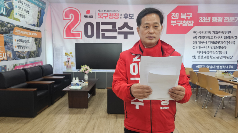 이근수 대구 북구청장 예비후보가 차기 대구시장 선거에 출마하는 후보들을 향해 ‘북구 7대 핵심 현안’을 시장 공약으로 채택해 줄 것을 촉구했다.이 예비후보는 16일 건의문을 통해 “33년 공직 인생과 북구 부구청장으로서 현장을 누비며 체감한 주민들의 절박한 목소리를 담아 제안한다”며 “북구가 혁신해야 대구의 균형 발전이 완성된다”고 강조했다.그는 수십 년간 방치된 이전 부지와 유휴지 문제가 주민들에게 소외감과 지역 정체 위기를 안겨주고 있다고 지적하며, 북구 발전을 위한 핵심 과제를 차기 대구시장 공약에 반영해야 한다고 주장했다.이 예비후보가 제시한 북구 7대 핵심 현안은 ▲시청 이전 조기 추진 ▲금호워터폴리스 기회발전특구 성공적 안착 지원 ▲경북농업기술원 부지 개발 책임 추진 ▲농수산물도매시장 후적지 전략적 활용 ▲운전면허시험장 이전 및 후적지 개발 ▲대구소년원 이전 추진 ▲20년째 방치된 칠성동 학교 용지 문제 해결 등이다.특히 그는 “옛 도청 후적지인 산격동 시청 청사의 조속한 이전과 함께 일대 재개발을 추진해 북구 중심 지역의 활력을 되살려야 한다”고 주장했다. 또 금호워터폴리스에 대해서는 “대구의 핵심 경제 거점으로 자리 잡을 수 있도록 대구시 차원의 적극적인 지원이 필요하다”고 말했다.칠성동 학교 용지와 관련해서는 “20년 넘게 방치된 문제를 더 이상 미룰 수 없다”며 “주민 교육권 보장과 생활 편의시설 확충이 조화를 이루는 상생 개발 방안을 마련해야 한다”고 강조했다.이 예비후보는 “구청장은 대구시장의 시정 철학을 시민 삶 속에서 구현하는 실천적 동반자”라며 “북구의 7대 현안은 대구 균형 발전을 위한 중요한 과제인 만큼 차기 시장 후보들의 실행 의지와 구체적인 계획이 필요하다”고 밝혔다.