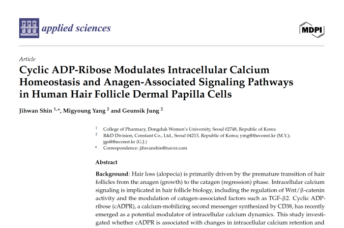콘스탄트(대표 정근식)의 탈모·두피 케어 브랜드 리필드 측은 자사 보유 성분인 ‘cADPR(사이클릭 ADP-리보스)’의 탈모 완화 효능을 다룬 연구 논문이 해외 학술지에 게재됐다고 16일 밝혔다.스위스 MDPI 산하 국제 학술지 ‘Applied Sciences(2026년, Vol. 16, Article 950)’에 실린 이번 논문은 cADPR 성분이 인간 모낭 진피유두세포(HHDPCs)의 칼슘 항상성 유지 및 모발 성장기 신호 전달에 미치는 영향을 확인한 결과물이다.이번 연구는 기존 케어 제품군의 성분 함유 위주 마케팅에서 탈피해, 모낭 세포 안의 신호 전달 시스템을 직접 조절하는 생물학적 기전을 과학적 수치로 확인하는 형태로 진행되었다.측정 결과, cADPR은 0.05 ppm의 농도 조건에서 세포 내 칼슘 수치를 6시간 넘게 안정적으로 유지했다. 이는 결과적으로 모발 생장을 돕는 ‘Wnt/β-catenin’ 전사 활성을 약 2.3배, ‘LEF-1’ 유전자 발현을 약 2.5배 상향시켰다. 반대로 모낭 퇴행을 일으키는 ‘TGF-β2’ 인자의 발현은 약 0.3배로 하향됐으며, 전 실험 구간 내 98% 이상의 세포 생존율을 기록해 제반 안전성을 확보했다.해당 독자 성분은 서울대 의과대학 출신 양미경 박사의 장기 연구 성과를 바탕으로 개발됐다. 양 박사는 과거 임상 데이터를 기초로 기존 탈모 관리의 단점을 극복하기 위해, 발모 촉진 신호를 향상시키고 탈모 인자를 낮추는 기전 연구를 계속해왔다.이 과정을 통해 세포 내 칼슘 신호를 보존하여 수백 개의 발모 사이토카인을 동시 자극하는 cADPR 기법이 완성됐다. 외부 영양분 주입 방식과 차별화하여 세포 스스로 발모 기반을 다지도록 유도하는 이 기술은 현재 한국, 미국, 중국에서 특허를 확보하고 있다.리필드를 전개하는 정근식 콘스탄트 대표는 “많은 헤어케어 브랜드가 기술력을 강조하지만, 그 근거를 국제 학술지 수준으로 직접 제시할 수 있는 브랜드는 많지 않다. 이번 논문 등재는 성분 하나도 과학적 설명이 가능한 브랜드로 자리매김하기 위한 리필드의 첫 번째 성취”라며, “현재 cADPR의 효능을 더욱 극대화하기 위해 엑소좀 기법의 신제품을 개발 중으로, 앞으로도 고객이 체감하는 효과는 마케팅이 아닌 정교한 연구에서 출발해야 한다는 믿음으로 기술 투자를 지속할 것”이라고 덧붙였다.