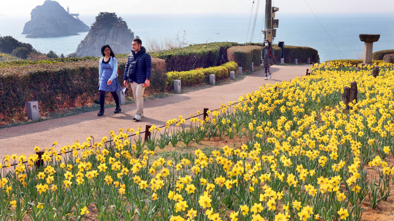 완연한 봄 날씨를 보인 16일 부산 남구 오륙도해맞이공원에 수선화가 피기 시작해 시민들과 관광객들의 눈길을 사로잡고 있다. 연합