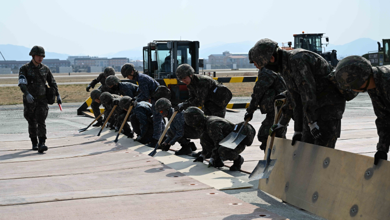 해군항공사령부는 지난 17일 부대 내 훈련장에서 ‘프리덤실드(FS)’ 연습과 연계해 활주로 피해복구 훈련을 실시했다고 밝혔다.이번 훈련은 포항공항 활주로가 적 공격으로 파손된 상황을 가정해, 신속한 복구를 통해 항공작전 지속 능력을 확보하는 데 초점을 맞췄다.훈련에는 공병대대 장병 60여 명과 로더·굴착기 등 중장비 12대가 투입됐다. 부대는 활주로 폭파로 대형 파손이 발생한 상황을 설정하고 피해 평가 후 항공기 이·착륙이 가능한 최소운영활주로(MOS)를 설정했다.이어 복구반은 굴착과 정지 작업을 통해 손상된 지면을 정비하고, 접이식 유리섬유 매트(FFM)를 설치해 활주로 기능을 복구했다. 마지막 단계에서는 골재를 포설하고 지면을 평탄화해 항공기 운용이 가능한 상태를 구현했다.해군항공사령부는 비상 상황 발생 시 관계 기관과 협조 체계를 유지해 항행 안전을 확보하고 있다고 설명했다.훈련을 지휘한 김희진 소령은 “전시 항공전력 유지에 필수적인 훈련”이라며 “신속하고 완벽한 복구 능력을 지속적으로 강화하겠다”고 말했다.