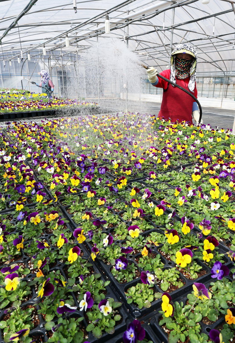 19일 광주 광산구 광주시농업기술센터 육묘장에서 센터 관계자들이 비올라, 팬지, 데이지 등 봄꽃에 물을 주고 있다. 연합
