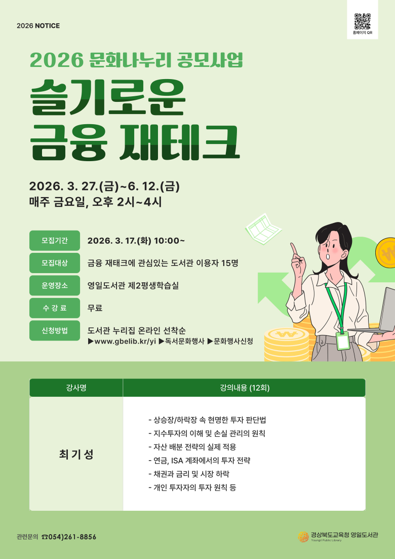 경상북도교육청 영일도서관이 지역 주민을 위한 금융 교육 프로그램을 마련했다.영일도서관은 오는 27일부터 6월 12일까지 매주 금요일 ‘2026 문화나누리 공모사업’의 일환으로 ‘슬기로운 금융 재테크’ 강좌를 운영한다고 19일 밝혔다.이번 강좌는 급변하는 경제 환경 속에서 주민들이 올바른 투자 관념을 확립하고 실질적인 자산 관리 능력을 기를 수 있도록 기획됐다. 강의는 매주 금요일 오후 2시부터 4시까지 도서관 제2평생학습실에서 총 12회에 걸쳐 진행된다.프로그램은 금융 전문가가 참여해 실생활에 바로 적용할 수 있는 내용 중심으로 구성됐다. 주요 교육 내용은 ▲상승장·하락장에서의 투자 판단법 ▲지수 투자 이해와 손실 관리 ▲자산 배분 전략 ▲연금 및 ISA 계좌 활용법 등으로, 초보 투자자부터 중급자까지 폭넓게 아우른다.수강료는 전액 무료이며, 금융 재테크에 관심 있는 도서관 이용자라면 누구나 참여할 수 있다. 자세한 일정과 신청 방법은 도서관 누리집에서 확인 가능하다.