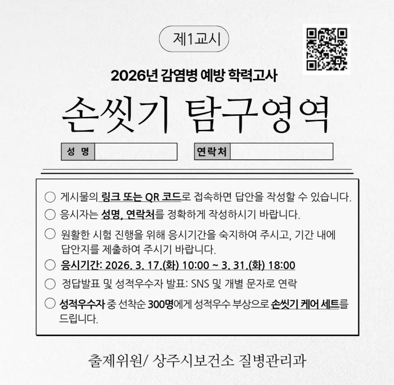 상주시보건소는 시민들의 올바른 손씻기 실천을 유도하고 감염병 예방의 중요성을 알리기 위해 오는 31일까지 ‘감염병예방 학력고사 손씻기 탐구영역’ 이벤트를 운영한다. 이번 이벤트는 상주시민 약 300여 명을 대상으로 진행되며 손씻기에 대한 이해도를 높이고 일상 속 실천을 독려하기 위해 기획됐다. 참여방법은 눈을 통해 홍보되는 ‘손씻기 탐구영역 문제풀이’ 게시물의 QR코드를 스캔하면 문제에 접속해, 답안을 작성하여 제출하면 참여가 완료된다. 상주시 보건소는 성적우수자 중 선착순 300명을 선정해 손씻기 케어 세트를 배부할 계획이다. 박영순 질병관리과장은 “손씻기는 감염병 예방의 가장 기본적이고 효과적인 방법”이라며 “이번 이벤트를 통해 시민들이 올바른 손씻기 습관을 생활화하는 계기가 되길 바란다”고 했다. 상주시보건소는 앞으로도 다양한 감염병 예방 캠페인을 통해 시민 건강 증진에 힘쓸 예정이다.
