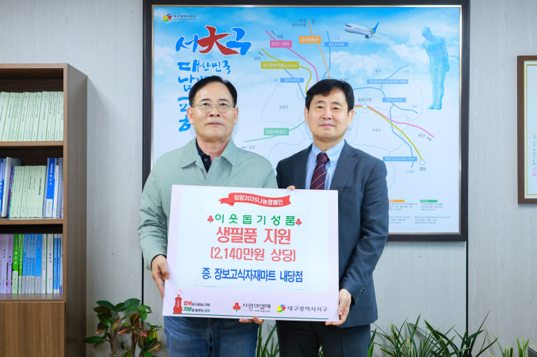 지역 식자재 전문 유통기업인 장보고식자재마트 내당점이 대구 서구에 이웃돕기 성품을 기탁했다.24일 서구에 따르면 장보고식자재마트 내당점은 최근 서구청에 라면, 두유, 생필품 등 2140만원 상당의 물품을 전달했다.전달식에는 성웅경 서구 부구청장과 박진환 본부장 등이 참석해 사업 현황과 사회공헌활동에 대한 의견을 나눴다.박진환 본부장은 “내당점 개소식 때 많은 주민이 매장을 방문해 성원을 보내주신 데 감사드린다”며 “지역민과 소상공인들에게 값싸고 좋은 제품을 제공해 모두가 상생할 수 있는 기업이 되도록 최선을 다하겠다”고 말했다.류한국 서구청장은 “유가 상승 등 어려운 대외 여건 속에서도 이웃을 위해 큰 나눔을 실천해 준 서정권 대표와 장보고식자재마트 내당점에 감사드린다”며 “기탁된 물품은 어려운 이웃을 위해 소중히 사용하겠다”고 밝혔다.기탁 물품은 행복마당 푸드마켓과 동 행정복지센터 등을 통해 지역 내 저소득 취약계층에 전달될 예정이다.