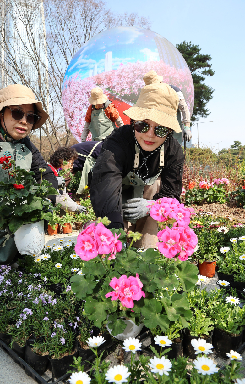 서울 송파구 마을정원사들이 24일 석촌호수 서호 둔치에 있는 미디어 아트 조형물 '더 스피어' 주변 화단을 봄꽃으로 단장하고 있다. 연합