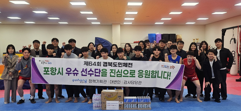 포항시가 경북도민체육대회를 앞두고 우슈 선수단을 찾아 격려하며 사기 진작에 나섰다.포항시 정책기획관과 대변인, 감사담당관 등으로 구성된 서포터즈단은 지난 24일 만인당 실업팀 우슈 훈련장을 방문해 선수들의 훈련 현장을 살피고 응원을 전했다.이날 서포터즈단은 대회를 준비 중인 선수들에게 이온음료와 과일 등 간식을 전달하며 컨디션 관리와 사기 진작을 도왔다.포항시는 향후 경기 일정에 맞춰 경기장을 직접 찾아 응원을 이어갈 계획이다.시 관계자는 “훈련에 매진하는 선수들에게 힘이 되고자 격려 방문을 마련했다”며 “선수들이 대회에서 최상의 기량을 발휘할 수 있도록 지속적으로 지원하겠다”고 말했다.한편 포항시는 정책기획관, 대변인, 감사담당관 등으로 구성된 종목별 서포터즈단을 운영하며 선수단 지원과 응원을 이어가고 있다.
