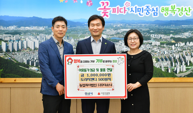 경산시 와촌면 소재의 농업회사법인 (주)다소니(대표 김희정)은 지난 25일 경산시청을 방문해 지역 내 어려운 이웃을 돕기 위한 성금 100만 원과 도라지 사탕 500봉지를 기탁했다.김희정 대표는 “지역에서 받은 신뢰와 성원을 나눔으로 돌려드리고자 했다”며 “앞으로도 지역사회와 함께하는 책임 있는 기업으로서 지속적인 나눔을 이어가겠다”고 전했다.경산시 관계자는 “지역사회를 위한 따뜻한 나눔에 깊이 감사드린다”며 “전해주신 성금과 물품은 경북사회복지공동모금회를 통해 잘 전달될 수 있도록 하겠다”고 말했다.