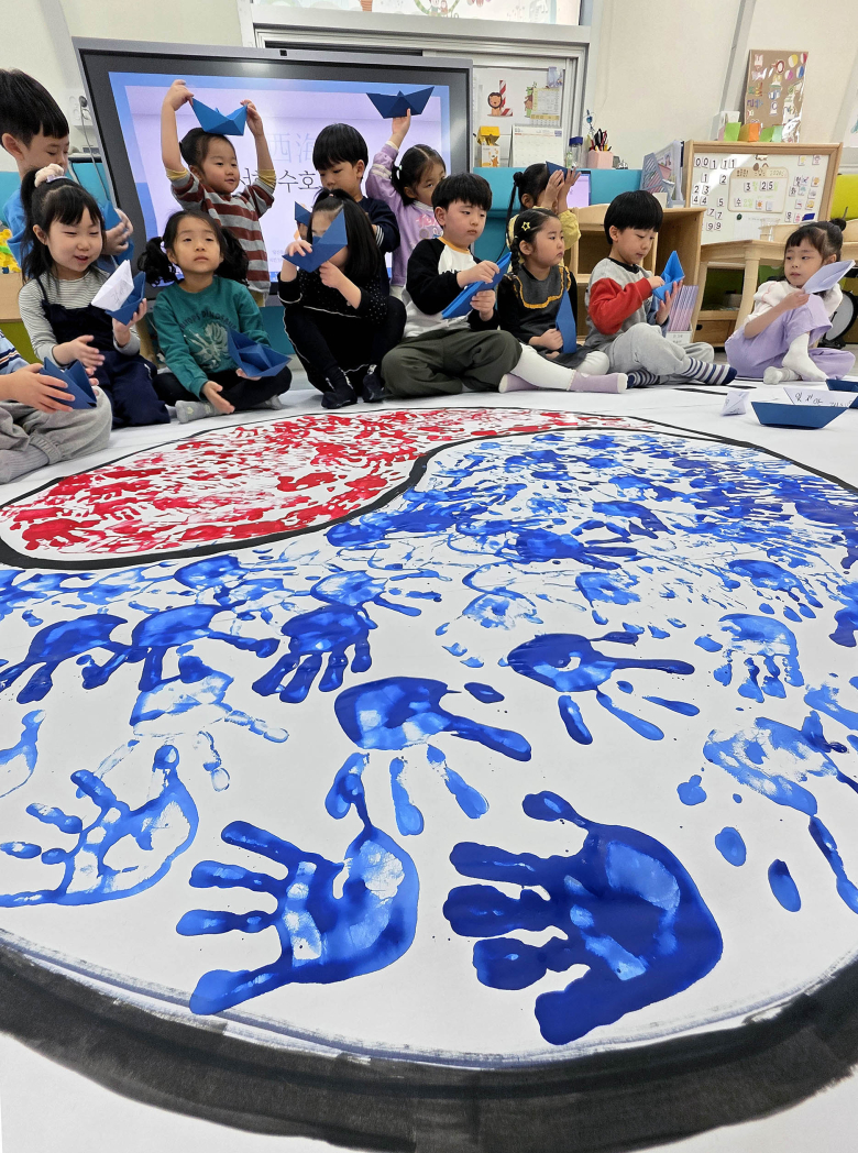 제11회 서해수호의 날을 하루 앞둔 26일 오전 광주 북구청직장어린이집에서 아이들이 태극기를 만들고 있다. 연합