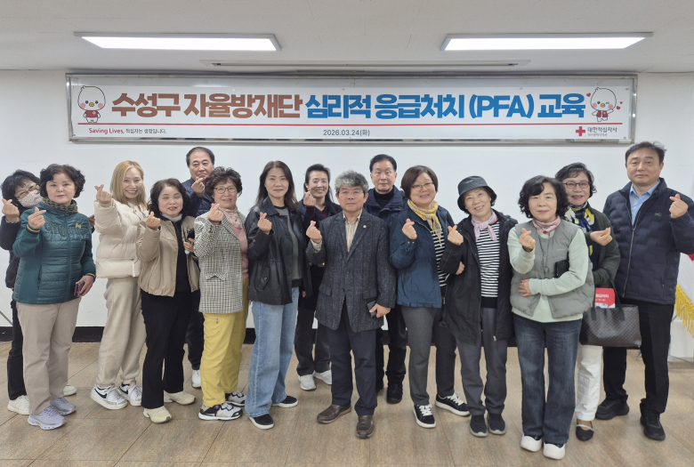 대한적십자사 대구지사가 재난 및 위기 상황에 대비한 심리적 대응 역량 강화에 나섰다.대한적십자사 대구지사는 지난 24일 지사 강당에서 수성구 자율방재단을 대상으로 심리적 응급처치(PFA) 교육을 실시했다고 29일 밝혔다.이번 교육은 재난 발생 시 현장에서 활동하는 자율방재단의 심리적 대응 역량을 높이고, 재난 경험자의 심리적 안정과 회복을 지원하기 위해 마련됐다. 교육에는 수성구 지역자율방재단원 15명이 참여했으며, 총 4시간 과정으로 진행됐다.교육은 재난 상황에서 나타날 수 있는 심리적 반응에 대한 이해를 바탕으로 초기 심리적 응급처치의 필요성과 기본 원칙, 현장에서 적용 가능한 대응 방법 등을 중심으로 이뤄졌다. 특히 재난 현장에서 피해자를 직접 대면하는 활동가들이 심리적 위기 상황에 적절히 대응할 수 있도록 실제 사례 중심의 교육이 진행됐다.배인호 대한적십자사 대구지사 회장은 “재난 현장에서 활동하는 자율방재단은 지역사회 재난 대응에 중요한 역할을 수행하고 있다”며 “이번 교육이 재난 경험자의 심리적 안정에 대한 이해를 높이고, 현장에서 활용 가능한 대응 역량을 강화하는 계기가 되길 기대한다”고 말했다.