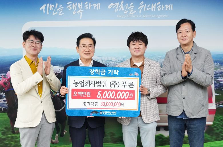 영천시장학회는 30일 북안면에 소재한 계란 생산·유통 전문 기업 농업회사법인 ㈜푸른에서 지역인재 양성을 위한 장학금 500만원을 기탁했다고 밝혔다.이번 기탁은 대를 이어 고향 영천에서 기업을 경영하고 있는 한충협 농업회사법인 ㈜푸른 대표가 지역 후배들의 성장을 응원하기 위해 마련했다.㈜푸른은 생산부터 판매까지 전 과정에 걸쳐 해썹(HACCP, 식품안전관리인증기준) 통합 인증을 획득한 지역 대표 우량 축산기업으로 소비자에게 안전하고 위생적인 먹거리를 제공하고 있다.