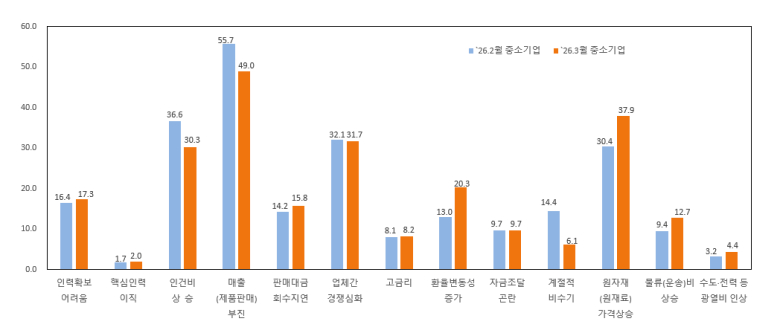 중소기업 경기전망이 한 달 만에 다시 하락세로 돌아섰다.중소기업중앙회가 지난 13일부터 19일까지 3057개 중소기업을 대상으로 실시한 ‘2026년 4월 중소기업 경기전망조사’ 결과에 따르면 업황전망 경기전망지수(SBHI)가 80.8로 전월 대비 1.7포인트 하락했다.업종별로는 제조업이 80.7로 전월보다 7.4포인트 크게 하락한 반면, 비제조업은 80.8로 0.8포인트 상승했다. 비제조업 가운데 건설업은 68.8로 1.5포인트 하락했고, 서비스업은 83.2로 1.3포인트 상승했다.제조업에서는 음료와 전자부품·컴퓨터·통신장비 업종 등이 상승세를 보였으나, 고무·플라스틱제품, 섬유제품, 인쇄업 등 다수 업종은 하락했다. 서비스업에서는 부동산업과 예술·스포츠·여가 관련 서비스업 등이 상승한 반면, 수리·기타 개인서비스업과 교육서비스업 등은 하락세를 나타냈다.항목별로는 수출(85.0), 영업이익(76.5), 내수판매(81.3), 자금사정(80.0) 등이 모두 전월 대비 하락했다. 반면 고용은 97.0으로 소폭 개선될 것으로 전망됐다.중소기업들은 경영 애로 요인으로 ‘매출 부진’을 가장 많이 꼽았으며 원자재 가격 상승, 업체 간 경쟁 심화, 인건비 상승 등이 뒤를 이었다.한편 2월 중소제조업 평균가동률은 73.6%로 전월 대비 0.2%포인트 하락했다. 기업 규모별로는 소기업이 소폭 상승한 반면 중기업은 하락했고 유형별로는 일반 제조업은 감소, 혁신형 제조업은 증가한 것으로 나타났다.