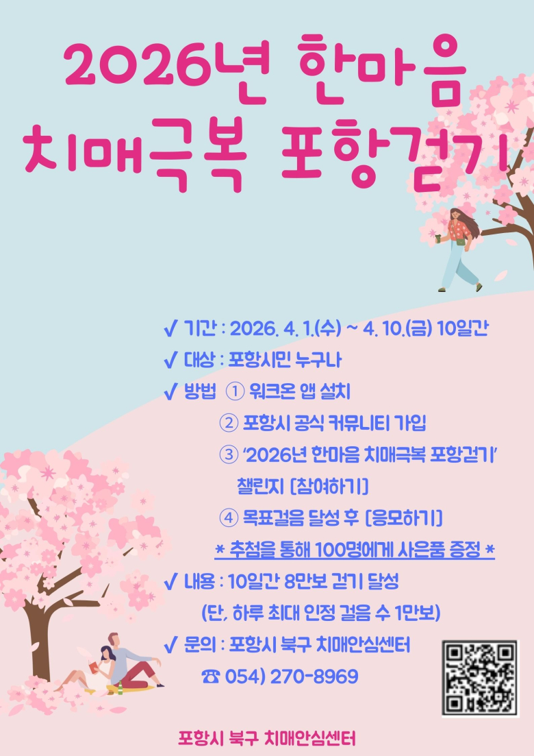 포항시 북구보건소가 시민들의 치매 예방 실천과 인식 개선을 위해 걷기 행사를 마련했다.북구보건소는 ‘함께하는 힘찬 걸음, 함께 만드는 치매극복’을 슬로건으로 한 '2026년 한마음 치매극복 포항 걷기 행사'를 오는 4월 1일부터 10일까지 10일간 개최한다고 밝혔다.이번 행사는 모바일 걷기 애플리케이션 ‘워크온(WalkOn)’과 연계해 진행되며, 참가자들은 행사 기간 동안 총 8만 보 걷기를 목표로 한다. 시는 시민들이 일상 속 걷기를 통해 자연스럽게 치매 예방 활동에 참여하고, 세대 간 공감대를 형성하는 계기가 될 것으로 기대하고 있다.참여 대상은 포항시민 누구나 가능하다. 참여를 원하는 시민은 스마트폰에 워크온 앱을 설치한 뒤 ‘한마음 치매극복 포항 걷기 행사’ 챌린지에 접속해 참여하기를 선택하면 된다. 이후 목표 걸음 수를 달성한 참가자는 응모 절차를 거쳐 추첨을 통해 100명에게 기념품이 제공될 예정이다.김숙향 북구보건소 건강관리과장은 “걷기 생활화를 통해 치매를 예방하고, 모바일 플랫폼을 활용해 다양한 연령층의 참여를 이끌어내겠다”며 “앞으로도 초고령사회에 대비한 치매 친화적 환경 조성에 지속적으로 힘쓰겠다”고 말했다.