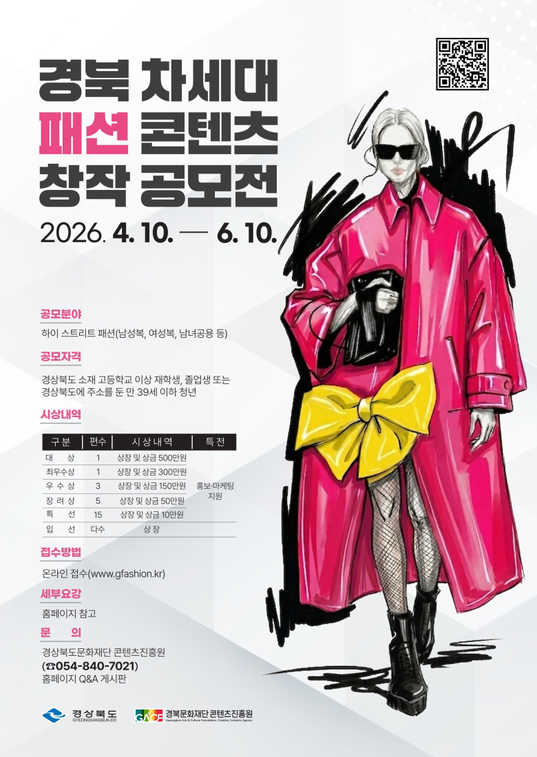 경북문화재단 콘텐츠진흥원이 ‘경북 차세대 패션 콘텐츠 창작 공모전’을 개최한다. 이번 공모전은 기존의 디자인 공모 형식을 탈피, 창작과 패션쇼까지 연계하는 게 특징이다. 이를 통해 창작자가 성장할 수 있도록 한다는 취지다. 그래서 관련 분야 학생들과 신진 디자이너들의 뜨거운 관심이 모아지고 있다.공모 주제는 자유롭고 힙한 감성을 담은 ‘하이 스트리트 패션(High Street Fashion)’. 남성복, 여성복, 유니섹스 구분 없이 창의적인 아이디어만 있다면 누구나 도전할 수 있다. 1차는 스타일화 심사다. 이를 통과한 지원자는 실물 작품을 제작해 패션쇼에 선보인다. 최종 심사를 거쳐 수상자를 뽑은 뒤 시상하는 방식으로 진행된다.신청 자격은 공고일 기준 경북 소재 고등학교 이상 재학생 및 졸업생, 혹은 경북에 주소를 둔 만 39세 이하의 청년이다. 개인 단위로 참여가 가능하며 접수는 6월 10일까지 공모전 공식 홈페이지(www.gfashion.kr)를 통해 진행된다.참가비는 무료이며 영예의 대상 수상자에게는 콘텐츠진흥원장상과 함께 500만 원의 상금이 수여된다. 또 입선을 제외한 20여 명의 수상자에게는 홍보·마케팅 지원을 통해 작품을 시장에 알릴 수 있는 혜택이 제공된다.이종수 진흥원장은 “이번 공모전을 통해 창의적인 패션 콘텐츠를 발굴하고 지역 패션 인재들이 성장할 수 있는 기회를 마련하고자 한다”며 “패션 분야에 관심 있는 청년들의 많은 참여를 바란다”고 전했다.