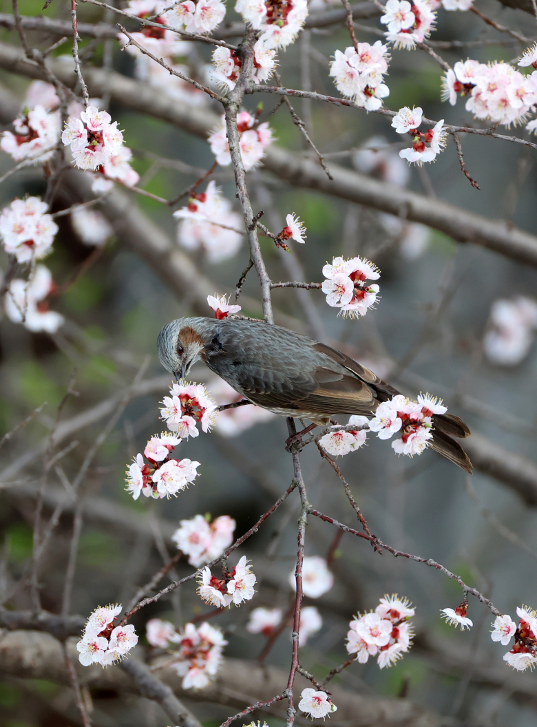 봄기운이 완연한 30일 강원 강릉시 교동의 분홍빛 꽃이 활짝 핀 살구나무에서 직박구리가 꿀을 찾고 있다. 연합