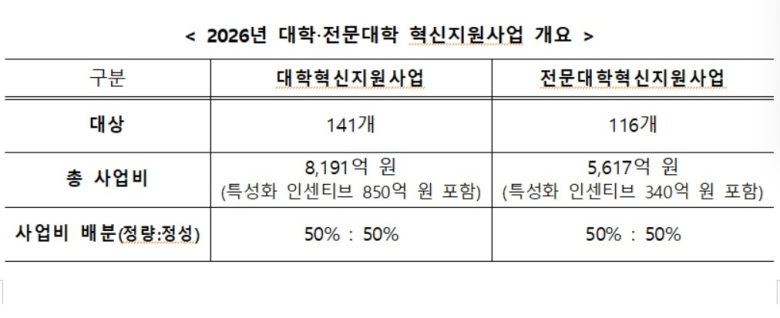 정부가 내년부터 대학 평가등급에 최하위 등급인 D등급을 신설하고 D등급 대학에는 재정지원 규모를 대폭 줄이기로 했다.반면 최고 등급인 S등급을 2년 연속 받은 대학에는 사업비 30%를 추가 지원하는 등 성과 기반 지원체계를 보다 강화한다는 방침이다.교육부는 30일 이러한 내용을 담은 '2026년 대학·전문대학 혁신지원사업 기본계획'을 발표했다.대학·전문대학 혁신지원사업은 대학이 자율적으로 중장기 발전계획을 수립·실행하고, 자체 역량을 높여 혁신할 수 있도록 교육부가 지원금을 주는 사업이다.사업 2년 차인 올해는 4년제 대학 141개에 총 8191억원, 전문대 116개에 5617억원이 지원된다.교육부는 혁신 성과가 우수한 대학에는 재정지원을 확대하고, 미흡한 대학에는 단계적으로 지원을 축소할 방침이다. 평가등급은 S·A·B·C 등급으로 나뉜다.우선 2년 연속(2025∼2026년) S등급을 받은 대학에는 정성 성과 사업비 30%를 추가 지원하기로 했다.반면 2년 연속 C급을 받은 대학에는 정성 성과 사업비를 아예 주지 않고, 정량 성과 사업비를 30% 감액한다.특히 2027년부터는 최하위 등급인 D등급을 신설한다. D등급 대학은 당해 연도 사업비 일부가 감액되고, 2년 연속(2027∼2028년) D등급을 받을 시 5년간 재정지원이 제한된다.또한 사업 목적 외 예산을 사용하는 등 부청청구 행위가 있을 경우, 사업비 환수는 물론 제재 부가금을 최대 5배 부과할 계획이다.이와 관련해 교육부는 "혁신지원 사업의 성과 기반 운영 원칙을 명확히 하기 위한 것"이라고 설명했다.아울러 교육부는 사립대학구조개선법 시행(올해 8월)에 맞춰 선제적으로 정원을 감축하는 일반대학에 300억원, 전문대학에는 210억원을 추가 지원하기로 했다.최교진 교육부 장관은 "교육부는 우수한 성과를 보이는 대학에 대해 지원을 더욱 강화할 예정"이라며 "성과와 책임에 기반한 재정지원을 통해 대학 혁신 모형(모델)을 현장에 안착시키고 혁신 우수사례를 확산해 나가겠다"고 밝혔다.