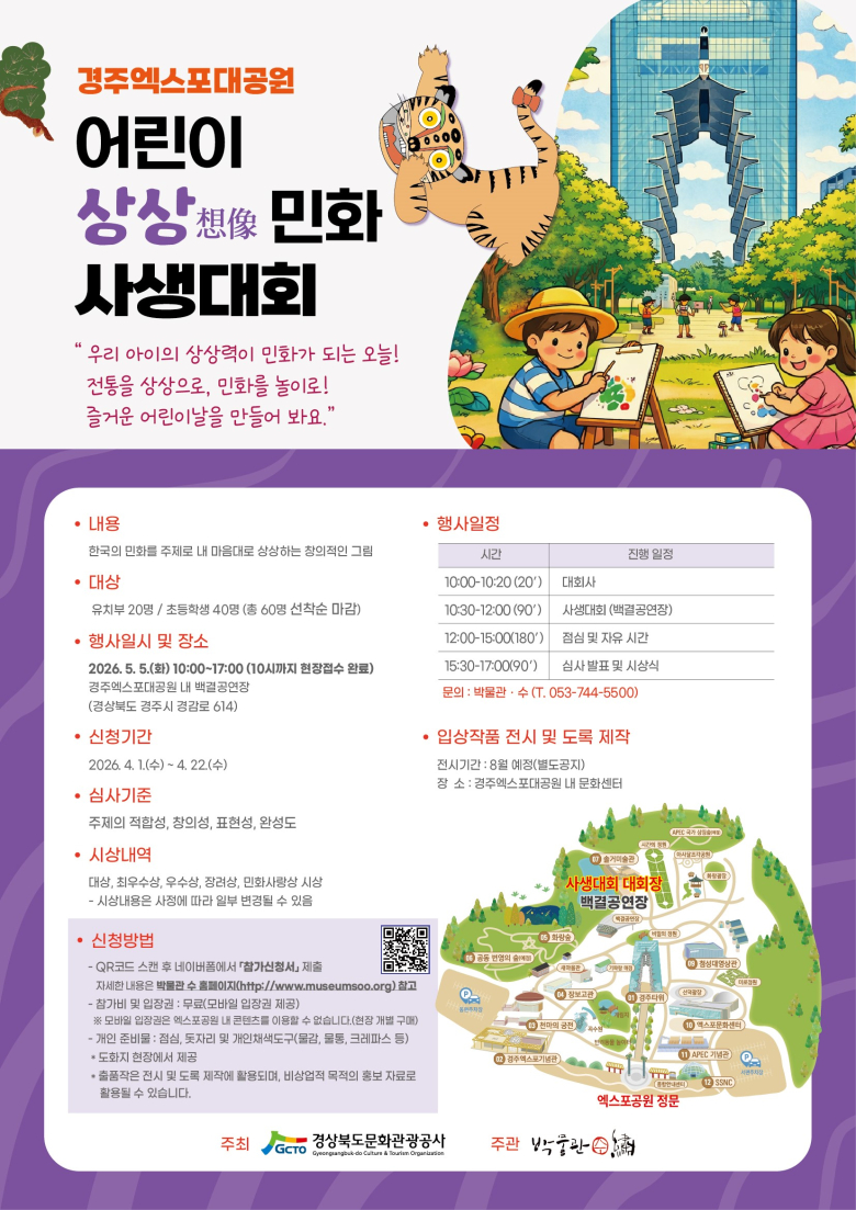 경북문화관광공사(사장 김남일)는 우리 민화의 아름다움을 현대적으로 계승하고 어린이들에게 창의적인 배움의 기회를 제공하기위해 오는 5월 5일 ‘어린이 상상(想像) 민화 사생대회’를 개최한다.이번 대회는 ‘한국의 민화를 내 마음대로 상상하는 창의적인 그림’이라는 주제로 어린이들이 자유롭게 상상력을 발휘해 민화로 표현하는 대회다. 참가 신청은 네이버 폼을 통해 이달 1일부터 22일까지 사전 접수하며 유치부 및 초등부 어린이라면 누구나 무료로 참여할 수 있다. 자세한 내용은 ‘박물관 수’ 홈페이지를 참고하면 된다.시상은 현장에서 전문가 심사를 통해 진행되며 유치부 및 초등부(저학년‧고학년) 3개 부문으로 나눠 대상, 최우수상 등 다양한 시상이 진행될 계획이다.대회는 경주엑스포대공원 백결공연장에서 5월 5일 진행되며 민화 사생대회와 더불어 목각 인형 체험 등 부대 프로그램도 함께 운영될 예정이다. 또 이번 행사에 출품된 작품은 8월 중 경주엑스포대공원 문화센터에서 전시되며 도록으로도 제작돼 더 많은 시민들에게 선보일 예정이다.김남일 사장은 “앞으로도 이 대회를 가족이 함께 참여하고 즐길 수 있는 문화행사로 만들어 가겠다”고 전했다.