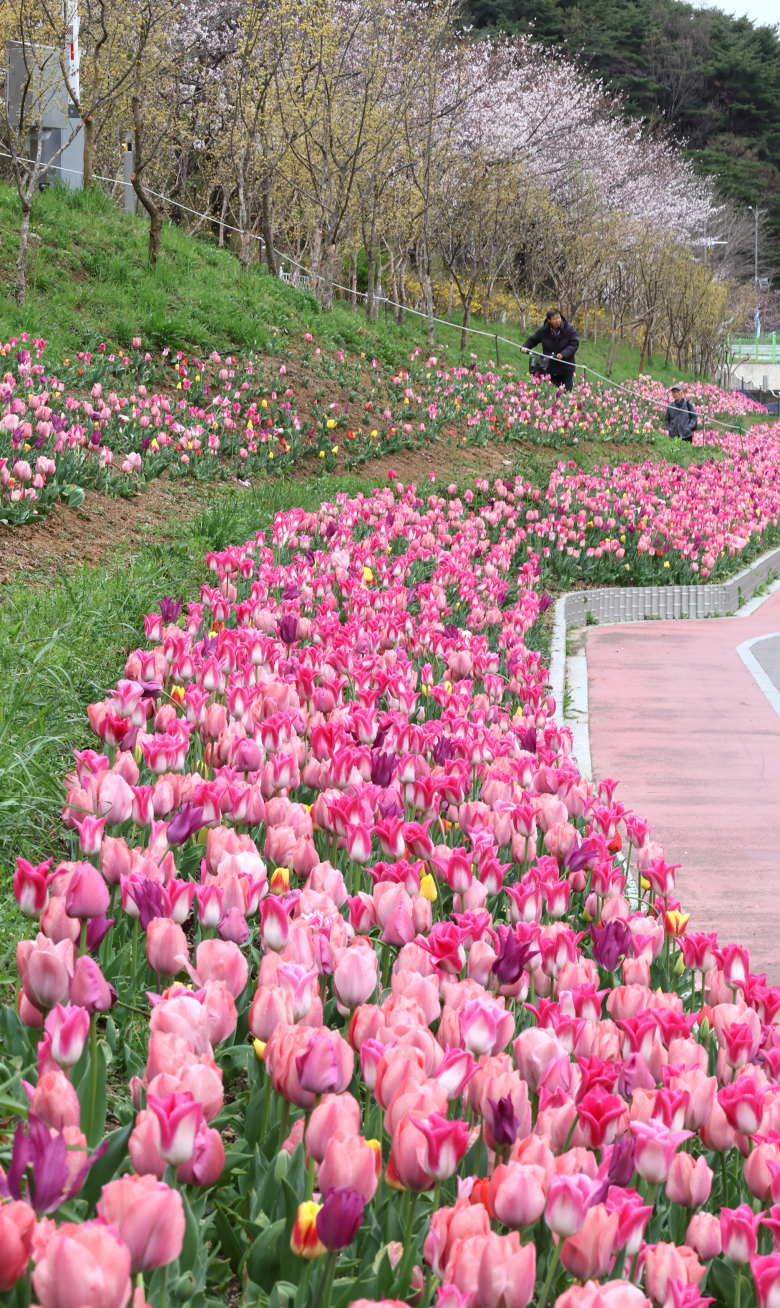 간밤에 비가 내리고 개인 31일 오전 부산 기장군 좌광천 일원에 화려한 튤립 꽃길이 조성돼 이용객들의 눈길을 사로잡고 있다. 연합