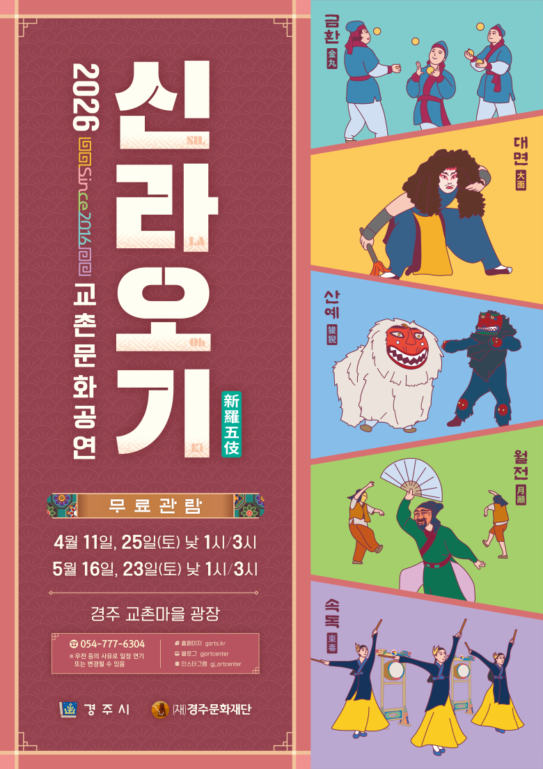 2016년 첫선을 보인 ‘교촌문화공연 신라오기’는 지난 10년간 경주교촌한옥마을을 대표하는 브랜드 공연으로 많은 사랑을 받아왔다. ▲금방울을 공중으로 주고받는 화려한 기예 ‘금환(金丸)’ ▲역신을 쫓는 강렬한 가면극 ‘대면(大面)’ ▲서역에서 전래된 사자춤 ‘산예(狻猊)’ ▲관객과 호흡하며 펼치는 풍자극 ‘월전(月顚)’ ▲북소리에 맞춘 역동적인 군무 ‘속독(束毒)’이 차례로 펼쳐지며 관객들의 눈과 귀를 사로잡는다. 특히 이번 공연은 지역에서 활동하는 전통연희극단 두두리와 너울무용단 등 실력파 예술인 30여 명이 출연해 숙련된 연기와 기예를 선보이며 마당극 특유의 연출과 무대매너를 통해 친근하고 흥겨운 분위기를 만끽할 수 있다. (재)경주문화재단 오기현 대표이사는 “앞으로도 경주시의 아낌없는 투자와 지역 예술인들의 열정을 발판 삼아 우리 전통의 멋과 해학이 넘치는 명품 공연으로 자리매김하도록 관심을 부탁드린다”고 전했다. ‘2026 교촌문화공연 신라오기’는 4월부터 9월까지 총 9회에 걸쳐 진행될 예정이다. 공연일정은 경주문화관광 홈페이지 또는 경주문화재단 홈페이지(www.garts.kr)에서 확인할 수 있으며 자세한 사항은 경주문화재단 관광사업팀(054-777-6304)으로 문의하면 된다.