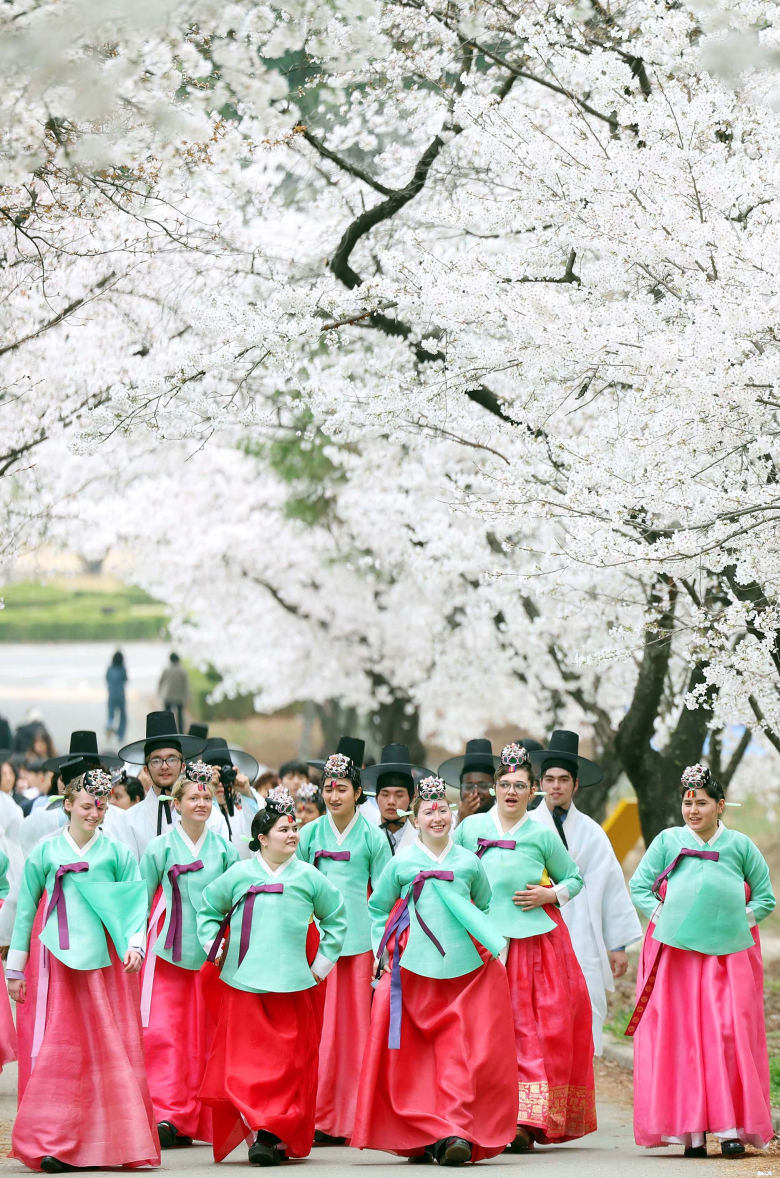 1일 오후 영남대학교 경산캠퍼스에서 한국을 찾은 미국의 고등학생들이 한국 전통 성년식을 체험하고자 봄꽃 가득 핀 길을 따라 행사장으로 이동하고 있다. 연합