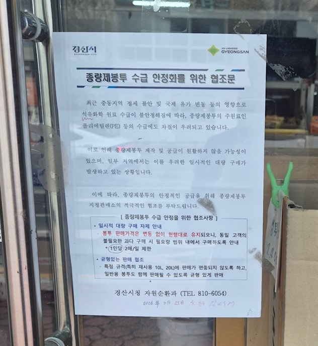 경산시는 최근 중동 전쟁 여파로 전국적인 종량제봉투 사재기 현상과 관련해 “경산시는 종량제봉투 공급에 문제가 없다”고 지난 1일 밝혔다.시는 종량제봉투 원자재 공급 차질이 지속될 수 있다고 판단해 지난달 3차례에 걸쳐 읍·면·동 행정복지센터에 공문 발송 등으로 선제적 대응을 위해 수시로 재고량을 점검하는 등 안정적인 공급을 위해 생산업체는 물론 지속적인 모니터링을 하고 있다.또한 지난 3월에는 1차 75만 매, 2차 46만 매를 공급했고 4월에는 총 170만 매 이상을 시중에 공급할 예정으로 시민들의 사재기가 없다면 정상적으로 물량이 풀려 종량제봉투 대란이 없을 것으로 판단된다.그리고 지금 이슈가 되고 있는 종량제봉투 가격 인상은 현재 시 조례로 정해져 있어 인상 계획이 없고 재고가 소진될 경우에도 추가 대책을 마련해 시민들의 불편이 없도록 제작업체와 긴밀히 협의하여 선제적으로 대응할 계획이다.특히 종량제봉투의 안정적 수급을 위해 ▲필요한 만큼만 구매 후 사용 ▲재활용품(플라스틱, 비닐류 등) 분리배출 철저 ▲가정 내 보관 중인 종량제봉투 우선 사용을 당부했다,