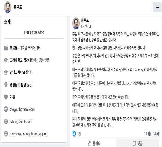 홍준표 전 대구시장이 더불어민주당 소속으로 대구시장 선거전에 뛰어든 김부겸 전 총리를 지지한다는 입장을 표명하면서 앞으로 이번 선거전에 새로운 변수가 될 전망이다.홍 전 시장은 2일 오전 자신의 페이스북을 통해 "후임 대구시장이 능력 있고 중앙정부와 타협이 되는 사람이 됐으면 좋겠다는 뜻에서 김부겸 전 총리를 언급한 것"이라고 밝혔다. 하지만, 홍 전 시장은 "민주당을 지지한 게 아니라 김부겸을 지지했다고 봐주시면 된다"며 "김 전 총리와의 회동은 오해를 증폭시킬 우려가 있기에 하지 않을 것"이라고 국민의힘을 의식한 표현을 사용했다.또 "대구는 막무가내식 투표를 하니까 민주당 정권이 도와주지도 않고 버린 자식 취급을 하는 것"이라며 "광역 자치단체장은 행정가이지 싸움꾼이 아니다. 대구에 도움이 된다면 당을 떠나 정치꾼이 아닌 역량 있는 행정가를 뽑아야 한다"고 강조했다. 홍 전 시장은 국민의힘 소속 대구시장 시절을 비롯한 여러차례에 걸쳐 김 전 총리에 대해 긍정적인 평가를 내놓은 바 있다.이와 관련, 김 전 총리는 이날 한 언론과의 인터뷰를 통해 "여러 가지 대구 현안을 위해서 (홍 전 시장을) 만나면 좋을 것”이라고 호응했다.이어 또다른 언론과의 인터뷰에서는 "약속은 안 잡혔지만 홍 전 시장을 만나야 한다"고 다시한번 만남을 추진할 뜻이 있음을 시사했다.이같은 상황에 대해 국민의힘 주호영 의원은 이날 한 언론에서 "우리 당 이름으로 시장을 하셨던 분이 민주당을 돕는 일은 안 생길 것"이라고 말했다.
