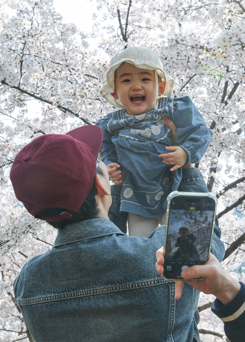 송파구 호수벚꽃축제 시작을 하루 앞둔 2일 서울 송파구 석촌호수에서 한 어린이가 벚꽃 아래에서 즐거워하고 있다. 연합