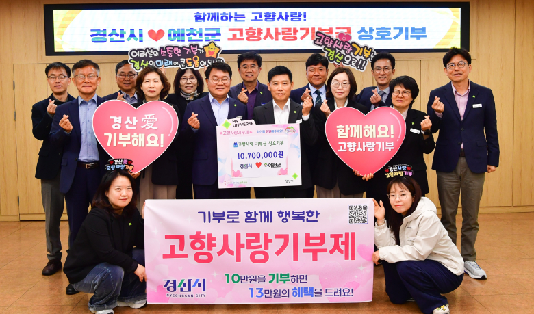 경산시는 지난 6일 경산시청 소회의실에서 고향사랑기부제 활성화를 위해 예천군과 고향사랑기부금 상호기부 행사를 가졌다고 밝혔다. 이번 상호 기부는 경산시 기획조정국과 행정지원국 소속 직원 107명, 예천군 직원 107명이 참여해 각각 1070만 원을 기부했으며 이를 계기로 고향사랑기부제에 대한 관심을 높이고 지역 간 교류와 상생협력을 더욱 확대해 나갈 계획이다.고향사랑기부제는 주민등록상 주소지를 제외한 다른 지방자치단체에 개인이 연간 2000만 원까지 기부할 수 있는 제도로, 주민복지 증진, 지역 발전을 위한 다양한 사업에 활용된다.경산시가 지난해 고향사랑기부금으로 추진한 응급의료 정보 관리 지원사업은 응급환자의 신속한 이송과 수용에 기여해 시민들로부터 큰 호응을 얻었다.