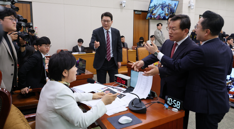 여야는 7일 국회에서 열린 '윤석열 정권 정치검찰 조작 기소 의혹 사건 진상규명 국정조사'에서 쌍방울 대북송금 사건을 수사한 박상용 검사의 지난 3일 국조 증인 선서 거부를 두고 또다시 맞부딪혔다.더불어민주당은 국민의힘이 진술 회유 의혹이 있는 박 검사를 변호하고 있다며 비판했고, 국민의힘은 박 검사 선서 거부의 정당성을 부각하며 중도 퇴장했다. 민주당 전용기 의원은 박 검사가 선서를 거부하고 퇴장한 뒤 국민의힘 윤상현 의원과 회의장 밖에서 얘기를 나누는 사진을 들고 "(박 검사) 대변인 노릇 한다고 바뀌는 것은 없다"며 "박 검사와 작전회의를 할 것이면 빨리 나가라"고 말했다. 전 의원은 "수사 무마 의혹에 대한 추가 녹취록을 오후에 들려드릴 테니 가서 같이 변명을 한번 짜보라"고 쏘아붙였다.같은 당 박선원 의원도 같은 사진을 들고 국민의힘 의원을 향해 "쪽팔리지?"라며 "김건희, 윤석열, 이단 목사 전광훈에게 의지하고 극우 유튜버 전한길에게 의지하더니 이제 박상용이 너희 살길이냐. 정신 차려. 똑바로 해"라고 소리쳤다. 이에 국민의힘 김형동 의원이 박 의원에게 다가가 "말을 그렇게 하는 것 아니다"라고 거세게 항의했다.민주당 소속 서영교 국조특위 위원장은 "밖에서 SNS와 방송을 통해 떠들던 박 검사가 여기서는 증인 선서를 거부한다"며 "국조 대상자가 선서를 거부하고 나가서 (국조) 위헌·위법을 운운하는 것은 공무원으로서 해선 안 되는 일"이라고 말했다.국민의힘 의원들은 국조가 시작하자 '이재명 죄 지우기 특위 반대'가 적힌 피켓을 위원 명패 앞에 붙이고 자리에 앉았다. 국민의힘 나경원 의원은 "박 검사는 법률에 따라 선서를 거부할 수 있다. (위원장이) 증언(거부 소명)을 못 하게 하고 강제로 퇴장시킨 것은 명백한 위헌·위법"이라며 "박 검사가 14일 (국조 청문회에) 출석하면 선서를 안 받고 증언할 기회가 있는지 들어야겠다"고 말했다.윤상현 의원은 "작전회의를 한다면 국정조사장 앞에서 하겠느냐"며 "의협심 있는 검사가 입법 독재 권력에 맞서 싸우는 모습이 기특해 보였고, 잠깐 만나 인사만 나눴다"고 반박했다. 그는 법무부가 박 검사 직무를 정지시킨 데 대해 "비위 사실이 통보되고 소명 기회가 주어져야 하는데 그러한 절차 없이 갑자기 징계가 됐다"며 "적법절차 원칙이 지켜진 것이냐"고 따져 물었다.국민의힘 의원들은 회의 시작 1시간 만에 회의장에서 퇴장한 뒤 자당이 별도로 진행한 '민주당의 공소취소·재판조작 진상규명 청문회'를 열었다. 국민의힘 특위 위원들이 주최한 단독 청문회에는 박 검사도 참석했다.이에 민주당 이용우 의원은 "청문회라는 명칭 자체를 쓸 수가 없다"며 "국민의힘이라는 정치 집단이 진행하는 정치행사에 현직 공무원인 박 검사가 참석해 발언하는 순간 수사 및 징계 대상에 해당한다"고 비판했다. 박성준 의원도 국정조사 직전 기자회견을 열고 "아무런 법적 근거가 없는 불법 청문회"라며 "국민의힘 의원들의 허위사실 유포, 명예훼손, 모욕 등이 발견되면 즉각 법적 조치하겠다"고 밝혔다.